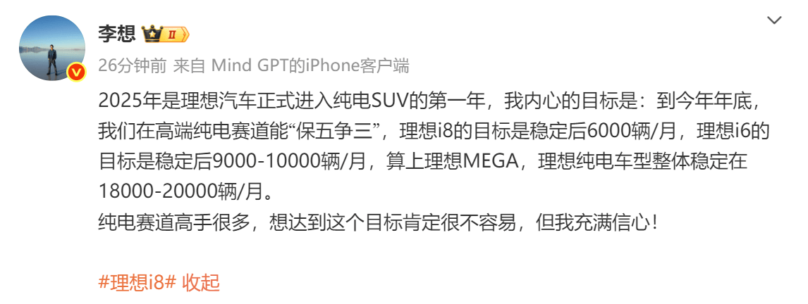 每经AI快讯,9月1日,理想汽车CEO李想微博发文表示,“2025年是理想汽车正式进入纯电SUV的第一年,我内心的目标是 到今年年底,我们在高端纯电赛道能“保五争三”,理想i8的目标是稳定后6000辆/月,理想i6的目标是稳 ...