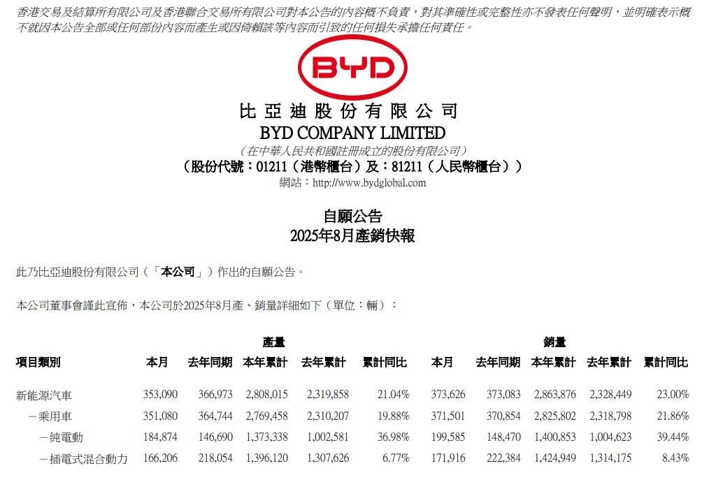 比亚迪9月1日公告,2025年8月新能源汽车销量37.36万辆,上年同期为37.31万辆;1-8月新能源汽车累计销量为286.4万辆,同比增长23%。 ![]() (文章来源:界面新闻) |