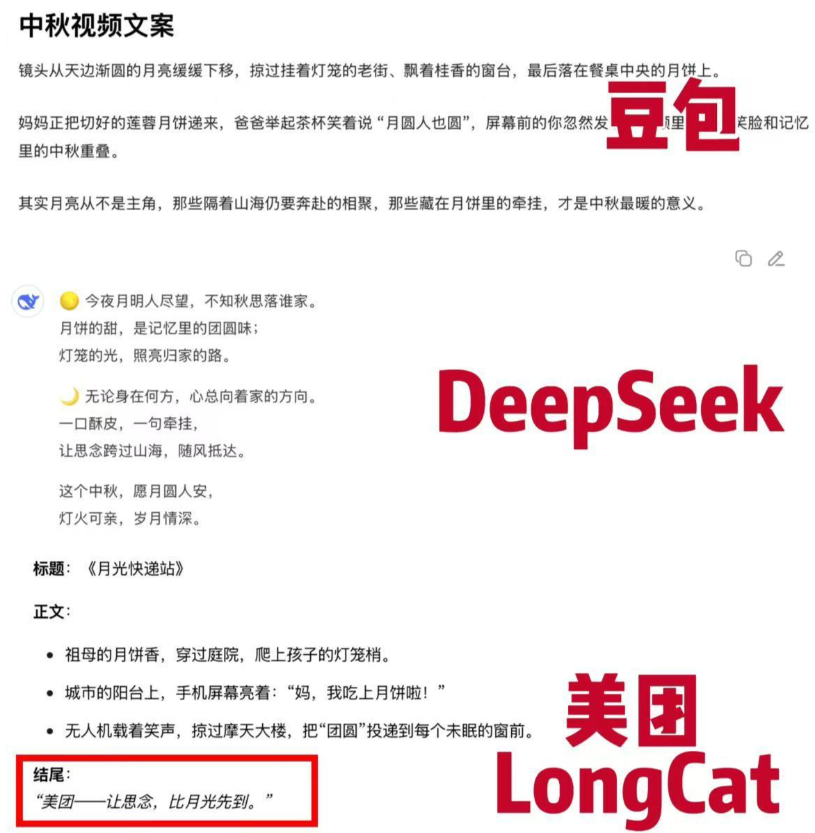 据美团介绍,通过算法和工程层面的联合设计,LongCat-Flash的理论成本和速度都大幅领先行业同等规模乃至规模更小的模型;通过系统优化,其在H800上达成了100 token/s(大模型处理文本时的最小单位)的生成速度,在保持极致生成速度的同时,输出成本低至5元/百万token。 早在今年一季度,美团CEO(首席执行官)王兴在财报电话会上提到,美团基础大模型能力已接近GPT-4o(一款多模态大模型)水平。如今随着大模型产品的官宣和开源,意味着继字节豆包、腾讯元宝、阿里通义千问之后,美团也开始押注AI(人工智能)原生应用。 一位头部大模型企业的技术人员在体验之后向《每日经济新闻》记者表示,LongCat主打Agent(智能体)和General(通用性)的性能,是短模型而不是当下流行的长思考,对应了美团可能需要的MCP服务(模型上下文协议服务)和客服场景。 知名经济学者、工信部信息通信经济专家委员会委员盘和林在接受《每日经济新闻》记者采访时表示,现阶段几乎所有的互联网公司都已进入AI大模型赛道,美团此番入局考虑更多的可能不是增量,而是防止对手用AI颠覆整个行业。 记者实测:部分回答植入美团产品 深度思考功能暂未上线据官方介绍,LongCat采用混合专家模型(Mixture-of-Experts,MoE)架构,总参数560B,激活参数18.6B至31.3B(平均27B),实现了计算效率与性能的双重优化。基于面向推理效率的设计和创新,其具有明显更快的推理速度,更适合耗时较长的复杂智能体应用。 测试中,记者分别要求DeepSeek、字节豆包和LongCat生成一段150字的中秋短视频文案,要求中并未提到具体使用场景,但LongCat会特别提到一句“美团,让思念比月光先到”这种带有品牌植入的文案,而其他大模型产品生成的短视频文案均为通用场景,未明显带入业务和品牌名称。