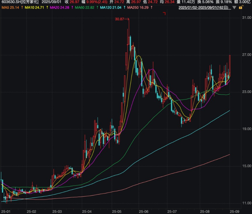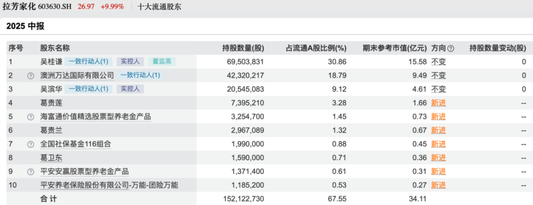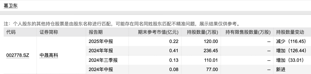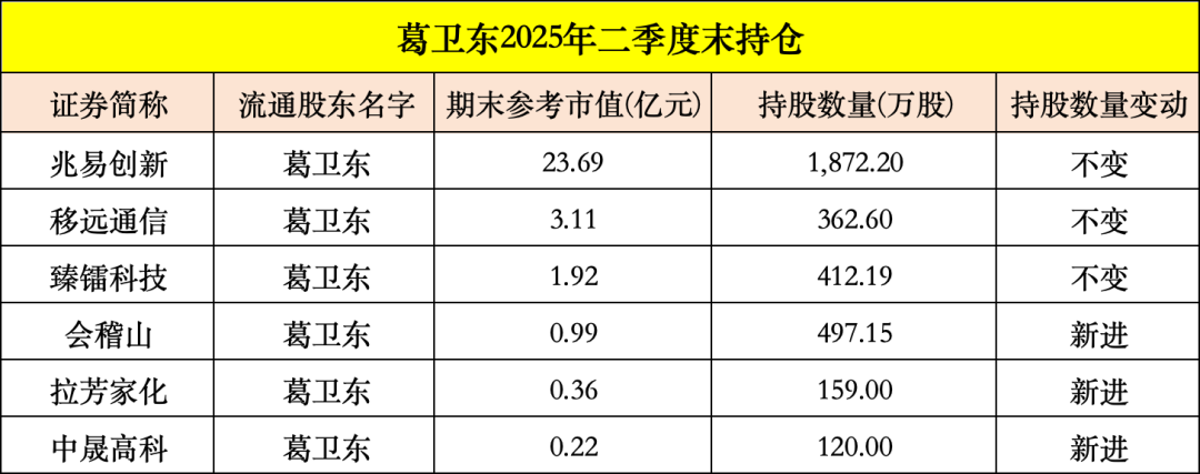 【导读】葛卫东A股持仓曝光,合计持有30.29亿元 随着A股上市公司2025年半年报披露完毕,私募大佬葛卫东的最新动向浮出水面。 数据显示,截至二季度末,葛卫东以个人名义现身6家上市公司的前十大流通股东名单,合计持股市值达到30.29亿元。具体来看,他仍持有臻镭科技、兆易创新、移远通信几只股票,保持持股不变;二季度,首次进入会稽山、拉芳家化两只消费股的前十大流通股东名单,再度加仓中晟高科。 ![]() 葛卫东家族持有2.69亿元 拉芳家化年初至今上涨近97% 半年报显示,今年二季度末葛卫东以个人名义现身拉芳家化的流通股东名单,但仅买进了159万股,期末参考市值仅3600万元,为第八大流通股东;葛卫东家族的葛贵莲、葛贵兰同样现身该股股东榜,分别买进了739.52万股、296.71万股,期末参考市值分别为1.66亿元、6700万元。二季度末,葛卫东家族三个人合计持有拉芳家化的市值为2.69亿元。 ![]() 值得一提的是,9月1日早间拉芳家化开盘股价直线拉涨,很快封住了涨停板。该股今年以来走势强劲,5月下旬一度涨至30.87元/股,但此后出现大幅调整,7月下旬该股重拾升势。截至9月1日,拉芳家化报收于26.97元/股,今年以来涨幅高达96.52%,最新总市值为61亿元。 ![]() 拉芳家化是国内知名日化企业,旗下拥有拉芳、美多丝、雨洁、曼丝娜等品牌。近年来公司推动品牌年轻化战略,加大电商渠道投入,并推出了多个新产品。 财报显示,拉芳家化上半年实现营业收入4.10亿元,同比下降4.27%;归母净利润为636.13万元,同比下降82.89%。 葛卫东和葛贵莲买进3.74亿元 会稽山今年以来涨超134% 除了拉芳家化,二季度葛卫东还新买进一家股价走势迅猛的消费品牌。 半年报显示,二季度末,葛卫东以个人名义现身会稽山的股东名单,持有497.15万股,期末参考市值为9900万元,为第八大流通股东;同时葛贵莲也成为新晋前十大流通股东,位列第四名,持有1380.20万股,期末参考市值为2.75亿元。两人合计持股市值为3.74亿元。 ![]() 资料显示,会稽山是知名的黄酒品牌,近年来其展开“年轻化”品牌战略,推出“会稽山爽酒”,以“气泡黄酒”概念进军新兴市场。从财务数据看,上半年会稽山实现营业收入8.17亿元,同比增长11.03%;归母净利润为9387.71万元,同比增长3.41%。 今年黄酒板块成为“新消费”热门赛道,受到资金关注。二季度,会稽山股价从11元/股附近攀升至26.39元/股,随后股价调整,8月下旬该股开始猛涨;9月1日该股盘中涨至26.50元/股,收盘报25.50元/股,今年以来涨幅超134%,最新总市值为122亿元。 ![]() 重回中晟高科股东名单 上半年归母净利润暴涨376.2% 葛卫东今年二季度末再度现身中晟高科的前十大流通股东名单,持有120万股,期末参考市值仅为2200万元。事实上,葛卫东去年二季度末就买进了中晟高科,此后多个季度逐步加仓,但今年一季度末短暂退出了股东名单。 ![]() ![]() 中晟高科今年1月完成重大资产出售重组相关事宜,彻底退出润滑油业务,成为一家以环保水处理业务为主、提供环境治理综合服务的高新技术企业。 财报显示,中晟高科上半年实现营业收入6421.71万元,同比下降73.31%;归母净利润为4700.99万元,同比增长376.2%。 但中晟高科今年股价走势波折,4月一度跌至13.93元/股的位置,此后出现大幅反弹,截至9月1日,该股报收于19.90元/股,今年以来涨幅为13.97%,最新总市值仅25亿元。 ![]() (文章来源:中国基金报) |
