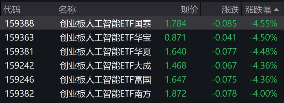 每经记者|叶峰 每经编辑|肖芮冬 创业板人工智能概念股走弱,润泽科技跌超8%,天孚通信跌超7%,新易盛、全志科技、网宿科技跌超5%。 受盘面影响,跟踪创业板人工智能指数的ETF跌超4%。 有券商表 ...