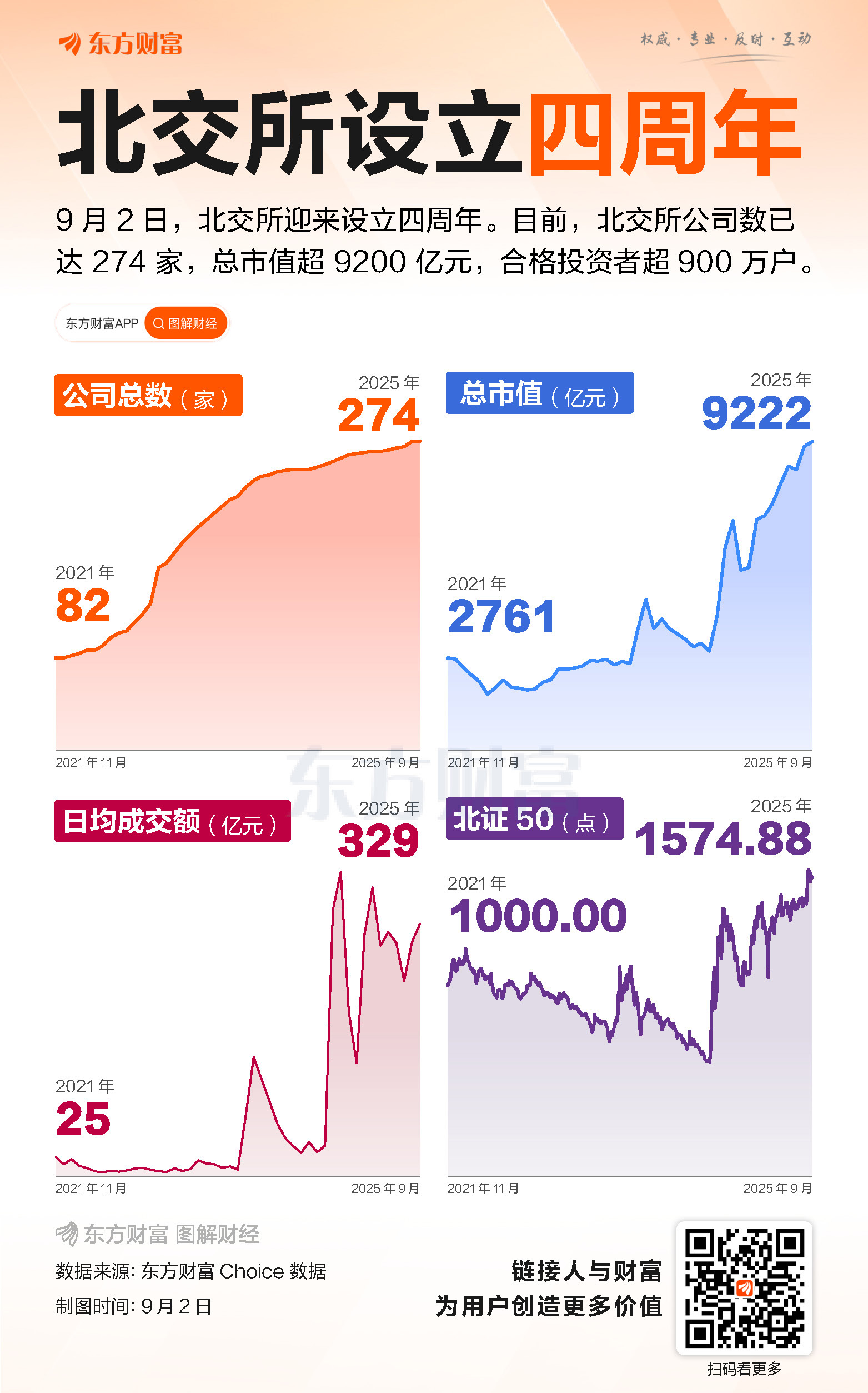 9月2日,北交所迎来设立四周年。东方财富Choice数据显示,目前,北交所上市公司已超270家,总市值超9200亿元,日均成交额超300亿元。另据媒体报道,北交所合格投资者已超900万户。 从近四年的变化来看,北交 ...