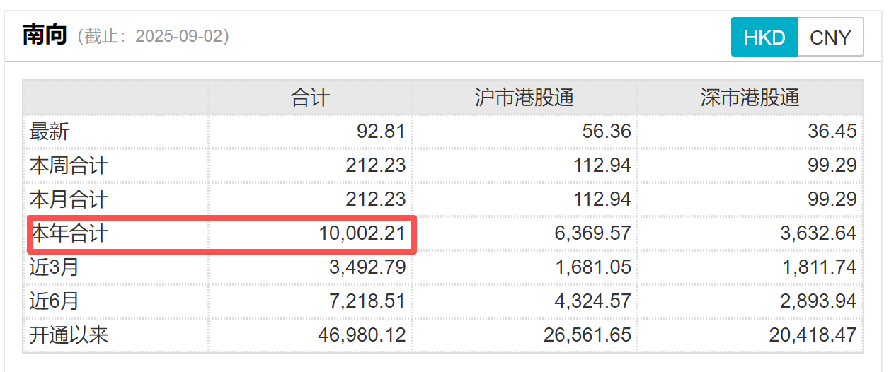 9月2日,南向资金净买入92.81亿港元,年度净买入额超1万亿港元,创下互联互通机制开通以来的最高纪录。截至目前,南向资金累计净买入港股市场的金额接近4.7万亿港元。 (文章来源:人民财讯) ...