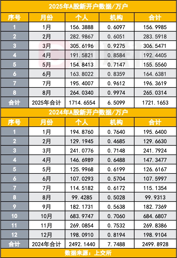 2025年8月A股新开户265万户,同比环比均有大幅增长。从月度对比来看,2025年1月A股新开户总数为157万户,2月的284万户实现了近翻倍增长,3月突破了300万户,4月因关税摩擦市场震荡环比下降37.22%,5月受假期影响 ...