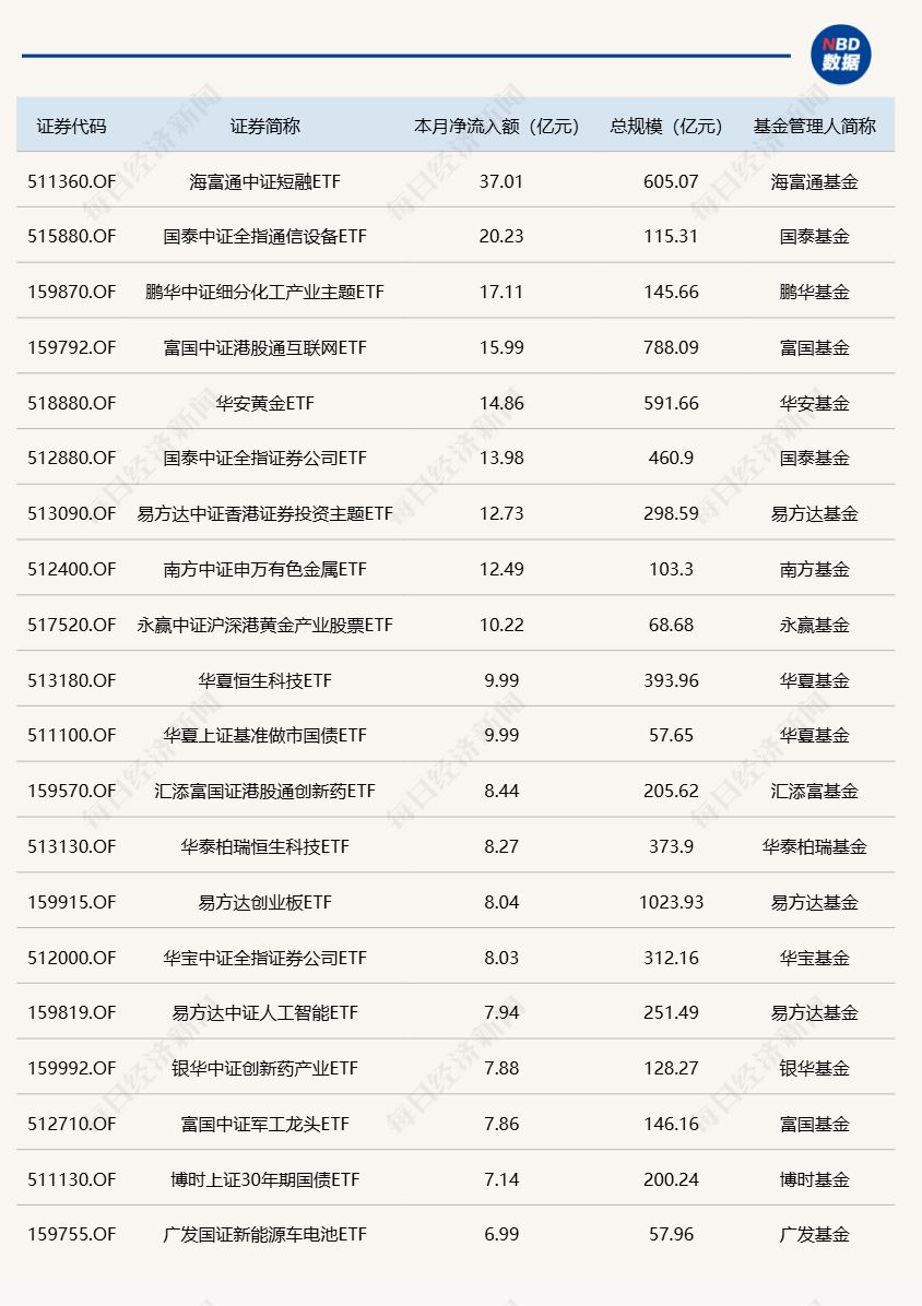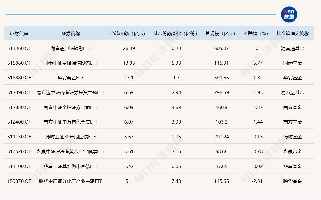 每经记者|肖芮冬 每经编辑|赵云 昨日市场震荡调整,创业板指领跌。板块方面,银行、贵金属、机器人、石油等板块涨幅居前,CPO、跨境支付、PCB、半导体等板块跌幅居前。 Wind数据显示,在9月2日的非货币ETF市场中,海富通中证短融ETF份额增加0.23亿份,净流入额26.39亿元;国泰中证全指通信设备ETF份额增加5.33亿份,净流入额13.93亿元;华安黄金ETF份额增加1.70亿份,净流入额13.10亿元。 与此同时,华夏上证科创板50ETF份额减少8.51亿份,净流出额11.95亿元;华泰柏瑞沪深300ETF份额减少2.43亿份,净流出额11.17亿元;国联安中证全指半导体ETF份额减少4.72亿份,净流出额6.46亿元。 截至9月2日,本月资金净流入额居前20的ETF名单如下: 总体看来,Wind数据显示,9月2日全市场ETF份额为28771.96亿份;总规模为51476.12亿元。近一周,份额增加最大的行业为金融,有24只基金跟踪。份额增加最大的主题为中证细分化工产业,有4只基金跟踪。份额增加最大的指数标的为港股通互联网,有4只基金跟踪;收益最高的指数标的为通信设备(+11.83%),有1只基金跟踪。 |