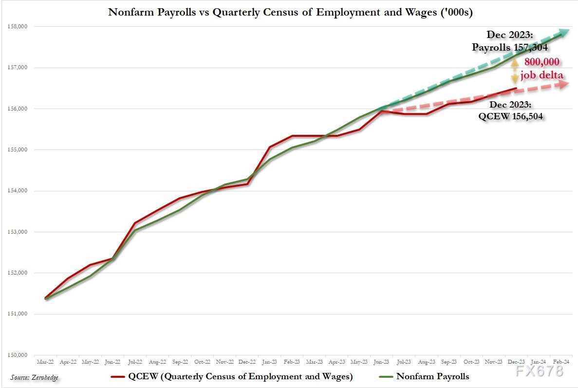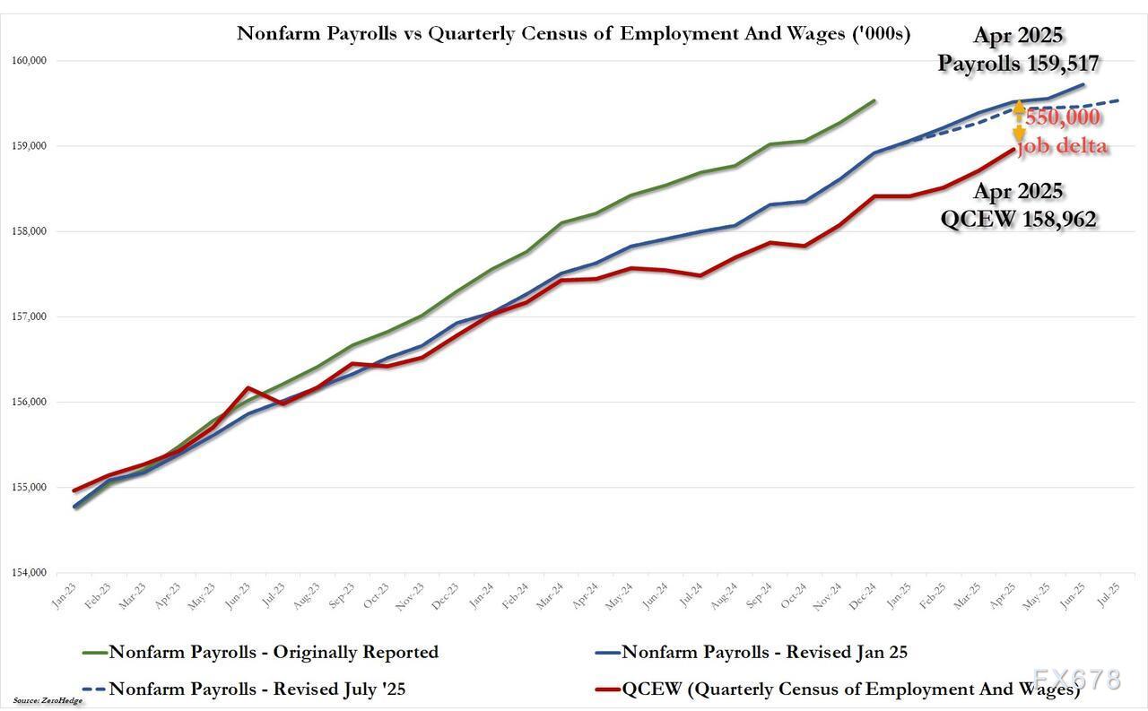 大约一年前,美国劳工统计局(BLS)源源不断输出的不实数据终于“绷不住了”。多年来,拜登政府领导下的劳工统计局一直在操纵就业数据,目的是让经济看起来比实际更强——哪怕只是为了给白宫提供说辞。其惯用手法包括:长期下修前一个月的数据,同时高估当月数据(直到下个月再下修),还用尽各种手段掩盖就业市场恶化的真相,比如全职岗位减少、兼职岗位增加、机构调查与家庭调查结果之间存在巨大差距、对“出生-死亡调整”(用于估算新增和倒闭企业带来的就业变动)的长期高估、过度依赖季节性调整来美化数据、从事多份工作的人数创纪录,以及非本土(即非法移民)劳动者数量异常等。这一切矛盾在2024年3月达到顶点。 ![]() ![]() 从背景来看,81.8万人的下修幅度是过去十年中最大规模的一次,也是历史上第二大下修,仅略低于2009年82.4万人的下修幅度。更重要的是,这次下修为三周后的“大幅降息”奠定了基础。2024年9月17日,美联储主席鲍威尔令市场震惊:他并未如预期的那样降息25个基点,而是大幅降息50个基点。 对于这次意外的大幅降息,各方给出了不同解释,其中最合理的来自荷兰合作银行的迈克尔·埃弗里——他指出,鲍威尔此举是在拼命“操纵局面”,以助力卡玛拉·哈里斯当选……“鲍威尔有明确动机在大选前降息50个基点,因为特朗普已明确表示,若当选将不会重新任命他为美联储主席,甚至可能提前将他免职。因此,鲍威尔若想保住职位,唯一的机会就是取悦卡玛拉·哈里斯及参议院中的民主党同僚。” 但由于鲍威尔绝不会承认美联储是一个“政治性机构”,他必须为这次降息寻找经济层面的理由,而这个理由正是“为贴合QCEW数据而进行的近乎创纪录的下修”。不妨看看美联储在大幅降息后的新闻发布会上,《经济学人》记者西蒙·拉比诺维奇与杰罗姆·鲍威尔的这段对话: 西蒙·拉比诺维奇:谢谢主席先生。您提到一直在密切关注就业市场,但也指出由于近期大幅下修,非农就业数据的可靠性有所下降。这是否意味着您会将重心完全放在失业率上?此外,根据SEP(经济预测摘要),失业率峰值预计约为4.4%,若失业率超过这一水平,是否会触发又一次50个基点的降息? 鲍威尔主席:我们仍会关注一系列广泛的就业市场数据,包括非农就业数据,不会弃用这些数据。我们会在心理上倾向于根据你提到的QCEW调整来调整数据。 显然,鲍威尔当时参考了三周前那份近乎创纪录的QCEW调整数据——即便没有其他原因,这也为他提供了“新冠疫情期间大规模降息以来首次大幅降息”的借口。而这次降息发生在大选前两个月,当时媒体还在吹嘘美国经济和就业市场的“良好态势”。 如今,鲍威尔将不得不再次面对类似局面:再过十天,美国经济将迎来又一次大规模非农就业数据下修,而目前市场已普遍预期9月17日将降息25个基点,这次下修很可能会打破平衡,促使美联储再次实施50个基点的大幅降息。 或许是因为总统权力交接的热度和假期临近,许多人忽略了一则消息:2024年12月17日,费城联储再次令全球经济学家震惊——它揭露了劳工统计局最新的数据造假行为,报告显示,2024年第二季度美国就业人数非但没有增长1.1%,实际反而下降了0.1%。有鉴于此,不难预测费城联储的最新数据将揭露劳工统计局更多的数据操纵行为,真实就业人数也会进一步下调。当然,目前我们已证实情况确实如此……但更大规模的下修还在后面。 首先,回顾上个月的惊人情况:7月非农就业新增人数仅为7.3万,远低于预期,创下去年以来的最低水平;而更令人震惊的是对前两个月数据的大规模下修,幅度近乎创纪录: 5月数据从新增14.4万下修至1.9万,减少12.5万; 6月数据从新增14.7万下修至1.4万,减少13.3万。 经此调整,5月和6月的就业人数合计比此前公布的数字少了25.8万。据高盛称,这是历史上最严重的两个月度数据下修之一。 这一事件最终导致特朗普愤怒地解雇了劳工统计局局长埃里卡·麦肯塔弗,并任命了对劳工统计局持怀疑态度的E.J.安东尼接任。安东尼是传统基金会首席经济学家,曾多次传播对就业市场的观察与分析。但这仅仅是个开始。 2025年9月9日,美国劳工统计局将发布非农就业数据的年度初步基准调整结果。此次调整将对2024年4月至2025年3月的非农就业数据进行重大修正,堪称2024年8月那次“震惊市场的调整”的翻版——正如前文所述,2024年的调整正是鲍威尔实施大幅降息的导火索。 此次大规模下修的理由十分充分,至少包括劳工统计局对“出生-死亡调整”的长期高估,更不用说该局为了“给糟糕的就业市场涂脂抹粉”而做出的其他各种假设——这些假设最终都会被悄悄修正。当然,这并非一家之言。 在2025年8月17日发布的一份报告中,高盛经济学家戴维·梅里克尔写道,在7月就业数据意外疲软后,该行对就业趋势增长的预估“如今已明显低于这一较低水平,降至每月3万人”;更重要的是,“未来就业增长数据更有可能被下修,原因包括:出生-死亡模型的估算可能过于宽松;就业增长趋势的变化最初可能被部分误归因于季节性因素的变化;在过去经济放缓时期,原始非农就业数据往往会被下修;ADP数据让人对官方公布的医疗行业就业增长数据产生怀疑;家庭调查目前高估了移民数量和就业增长。” 这番话听起来几乎和我们的观点如出一辙。在上述因素中,我们将重点分析高盛提出的两点,