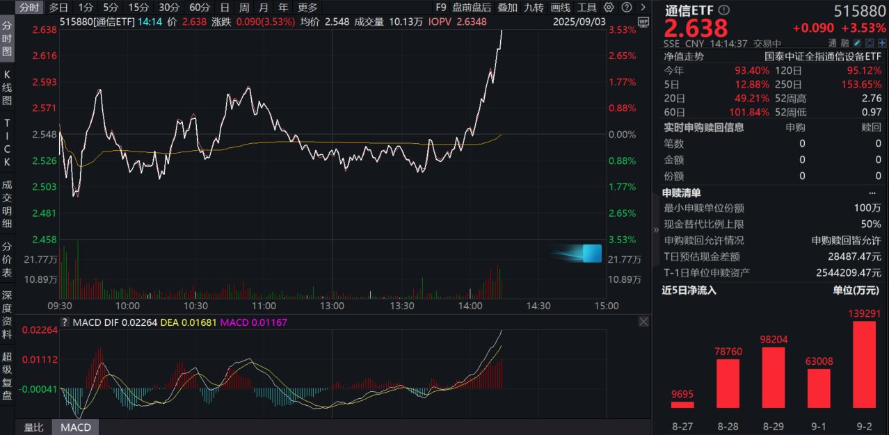 每经编辑|肖芮冬 光模块CPO概念近期持续强势,通信ETF(515880)午后反弹超3%,截至发稿,通信ETF年内二级市场涨幅超93%,居A股ETF榜首。 资金抢筹布局,通信ETF(515880)上一交易日资金大幅买入超13 ...