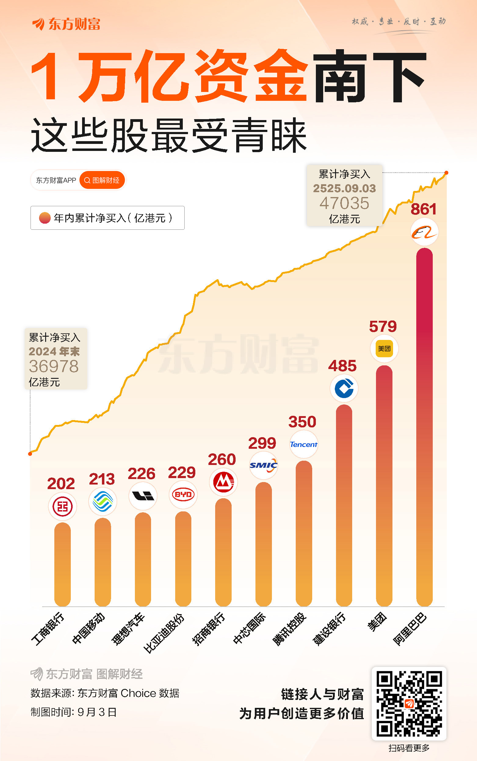 ![]() 今日(9月3日),港股高开低走小幅收跌,南向资金净买入55亿港元。 东方财富Choice数据显示,南向资金年内累计净买额已于昨日突破1万亿港元大关,今日这一数据已达10057亿港元(约9336亿元),刷新年度净买额历史纪录。 个股方面,以年内成交均价估算,阿里巴巴-W最受南向资金青睐,年内累计净买入861亿港元,持股市值高达2230亿港元,该股今年涨超65%。 美团-W紧随其后,年内累计净买入579亿港元,持股市值1054亿港元。该股年内调整明显,年内跌幅近34%。 建设银行位列第三,年内累计净买入485亿港元,持股市值2568亿港元。该股今年表现较强,累计涨幅近26%。 此外,腾讯控股、中芯国际、招商银行、比亚迪股份、理想汽车等多股今年也获南向资金爆买,且净买入金额均超200亿港元。 香港星汉资产管理公司指出,过去港股市场是一个由国际机构投资者和本地资金主导的离岸市场。目前,南向资金已成为港股的“稳定器”,内地投资者的话语权显著提升。南向资金偏好高股息资产,配置了许多金融、能源、电信股,近两年这些板块的估值得到显著提升。 (文章来源:东方财富研究中心) |