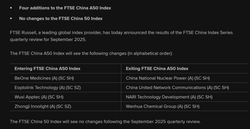 9月3日,富时罗素宣布对多只指数的季度审核变更。该变更将于2025年9月19日收盘后(即2025年9月22日星期一)生效。 在本次变更中,富时中国A50指数纳入百济神州-U、新易盛、药明康德、中际旭创等,被纳入的个 ...