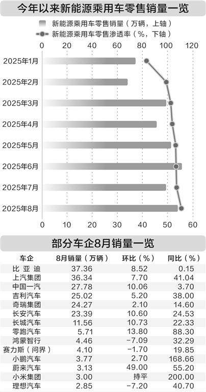 (本版数据由证券时报中心数据库提供) 证券时报记者 郭洁 9月3日,乘联分会数据显示,初步统计,8月全国乘用车市场零售195.2万辆,同比增长3%,较上月增长7%,今年以来累计零售1469.8万辆,同比增长9%。8月全国乘用车新能源市场零售107.9万辆,同比增长5%,较上月增长9%,全国新能源市场零售渗透率55.3%,今年以来累计零售753.5万辆,同比增长25%。 证券时报・数据宝根据乘联分会数据统计,今年以来,新能源乘用车已连续6个月零售渗透率超过50%,8月零售渗透率再创月度新高,并且首次突破55%。 从各家汽车厂商8月销量来看,小鹏汽车、零跑汽车、蔚来汽车等新势力车企单月交付量再创新高。 零跑汽车8月交付量达5.71万辆,同比增长超过88%,连续6个月稳居新势力品牌月交付领先位置。小鹏汽车8月共交付新车3.77万辆,单月交付量同比环比双增,创历史新高。蔚来汽车交付新车3.13万辆,同比增长55.2%,反超理想汽车。 比亚迪8月销售量为37.36万辆,比去年同期增加了543辆。长安汽车8月销量23.39万辆,同比增长近25%。长城汽车8月销售新车11.56万辆,同比增长超22%,创历史最佳8月销量表现。 奇瑞集团8月销售汽车24.27万辆,同比增长14.6%。值得一提的是,8月奇瑞出口汽车12.95万辆,同比增长32.3%,创单月出口新纪录,已连续4个月出口突破10万辆。 中国汽车流通协会表示,9月将进入“金九银十”传统旺季,叠加国补资金全面落地及地方性购车补贴密集跟进,消费者观望情绪有望缓解。结合8月下半月积累的复苏动能,预计9月市场表现将优于8月,乘用车终端零售有望实现环比增长。 据数据宝统计,汽车整车概念股年内股价平均上涨7.02%。千里科技的股价涨幅最高,年内股价累计上涨51.76%。9月2日,千里科技发布公告称,2025年8月公司总生产数量为1万辆,同比增加234.86%,总销售数量为1.11万辆,同比增加168.55%。 江淮汽车的股价涨幅次之,年内累计上涨38.48%。曙光股份、比亚迪、安凯客车、宇通客车的股价涨幅居前。 从业绩数据来看,比亚迪的净利润规模最高,上半年公司实现总营收3713亿元,同比增长23.3%,实现归母净利润155.1亿元,同比增长13.8%。2025年比亚迪海外市场表现非常亮眼,前8个月乘用车及皮卡海外累计销量已完成63.07万辆,公司全年海外市场销量目标设定为80万辆。 安凯客车的业绩增幅最高,公司上半年营业收入为15.9亿元,同比上升38.7%;归母净利润为1840万元,同比上升153.5%。福田汽车、赛力斯、金龙汽车、中通客车的净利润增幅居前,均超70%。 长安汽车近日接受机构调研时表示,今年下半年公司将推出多款全新智能体验的车型,长安启源Q07激光版将于9月上市;长安启源A06将在四季度上市。还有一款全新纯电小型SUV启源Q05,预计于四季度上市。 中集车辆近期获得机构调研时表示,2025年下半年,随着关税和“双反调查”结果的落地,市场观望情绪将大大缓解,加之2025年三季度为北美传统旺季,北美半挂车业务有机会进入到弱复苏状态。 从机构持股比例来看,相较于一季度末,二季度超八成汽车整车概念股获得机构加仓,其中13股的机构持股比例环比提升超1个百分点,包括福田汽车、江淮汽车、中国重汽、宇通客车、上汽集团等。 (责任编辑:王治强 HF013)