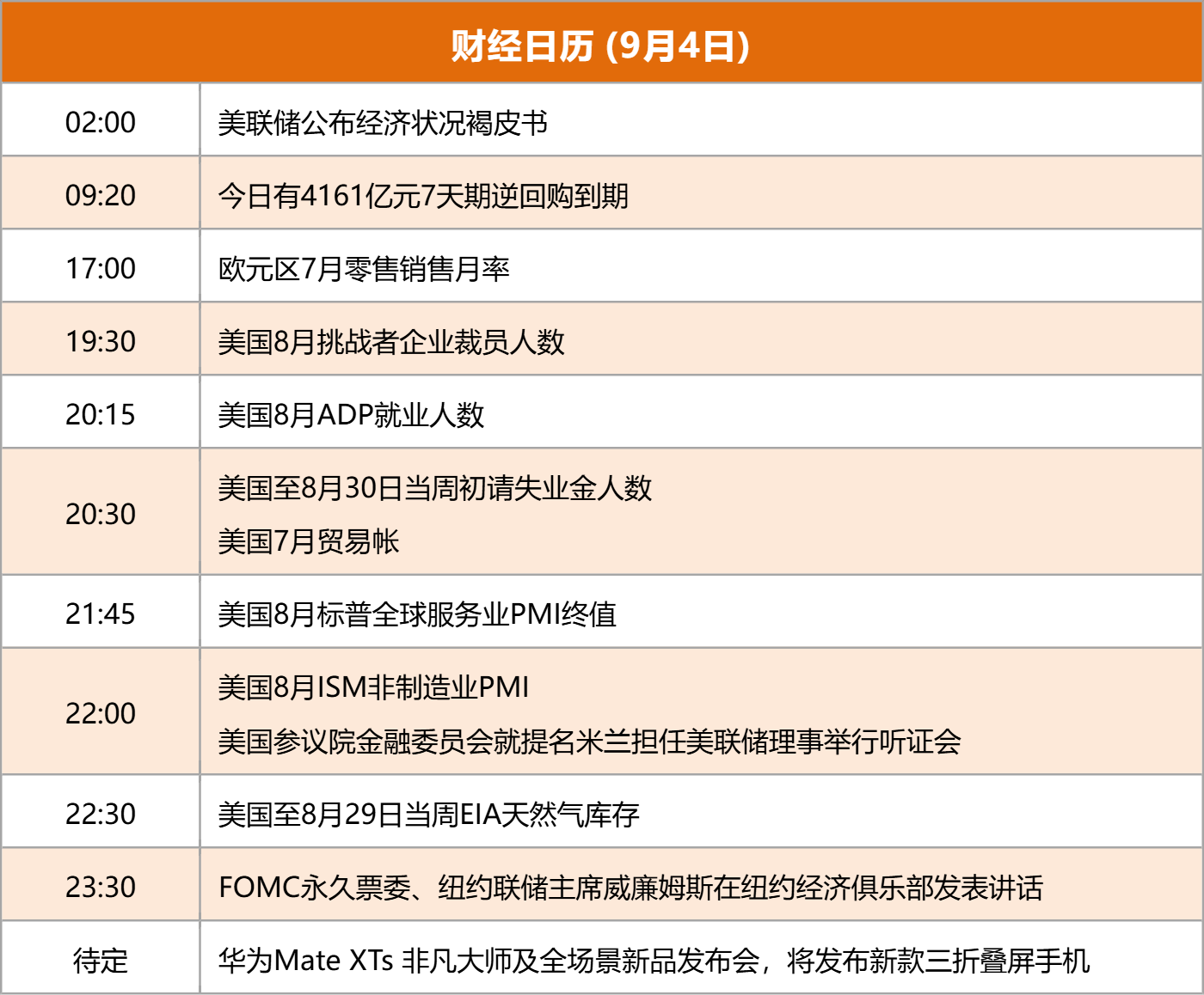![]() 每日精选财政部会议: 据财政部网站,近日,财政部与中国人民银行联合工作组召开第二次组长会议。会议肯定了去年联合工作组成立以来的成效,并就金融市场运行、政府债券发行管理、央行国债买卖操作和完善离岸人民币国债发行机制等议题进行深入研讨。双方认为财政政策与货币政策协同发力,为应对当前市场环境、推动经济回升向好提供了保障,并表示将继续深化合作,加强协同。 寒武纪或遭被动减持: 随着科创50指数样本即将迎来定期调整,A股的“新股王”寒武纪或将出现被相关基金减持的情况。根据上证科创板50成份指数编制方案,单个样本权重不超过10%,前五大样本权重合计不超过40%。目前跟踪科创50指数的产品共有72只,跟踪产品规模1890.30亿元(剔除联接基金,且剔除规模相等的不同份额)。如果据此计算,不考虑股价涨跌等其他因素,那么相关产品要减持寒武纪的规模合计将达到百亿元。 高盛预测: 高盛集团的亚洲业务高管对中国股市表达了乐观态度,称在资金回流推动下行情仍有上升空间,并透露公司正在香港和印度扩招。高盛亚太区(不含日本)总裁施耐德周三在接受采访时表示:“我们从客户和投资者那里听到的反馈是,围绕中国股市的情绪有所改善。中国依然面临许多挑战,但这一轮股市上涨还有动能。” 金价连创新高: 金价继续冲高。9月3日盘中,现货黄金一度触及3573美元/盎司,再创历史新高;COMEX黄金期货也将历史新高推升至3636美元/盎司。当天,国内多家品牌足金首饰价格上破1050元/克。 石油产量: 据消息人士称,欧佩克+将在本周日的会议上考虑进一步提高石油产量,以努力夺回市场份额。欧佩克+是石油输出国组织(欧佩克)和以俄罗斯为首的国家组成的联盟,其原油产量占全球原油总产量的近一半。分析师指出,虽然国际油价持续低迷,但欧佩克+不得不推进增产。一方面原因是该联盟正面临非欧佩克+产油国的竞争。另一方面,欧佩克+内部一些成员国也对长期执行减产颇为不满。 富时中国指数变更: 富时罗素9月3日宣布对富时中国50指数、富时中国A50指数、富时中国A150指数、富时中国A200指数、富时中国A400指数的季度审核变更。该变更将于2025年9月19日星期五收盘后(即2025年9月22日星期一)生效。其中,最受市场关注的富时中国A50指数本次纳入百济神州-U、新易盛、药明康德、中际旭创,同时剔除中国核电、中国联通、国电南瑞、万华化学。此外,本次季度调整中,富时中国A50指数的备选股名单为民生银行、洛阳钼业、同花顺、上汽集团、赛力斯。 日本股市下挫: 9月3日,日本央行行长植田和男在与日本首相石破茂会谈后表示,如果日本经济增长和物价符合展望,日本央行将加息。受此影响,日本股市全线下挫,东证指数大跌超1%。与此同时,日本国债市场也遭遇猛烈抛售,日本30年期国债收益率一度升至3.29%,创出历史新高。另外,美国30年期国债收益率一度升破5%,为7月18日以来的首次;英国30年期国债收益率升至1998年5月以来的最高水平。 车企业绩: 2025年上半年上市车企业绩均已悉数公布,比亚迪依旧有巨大的领先优势,营收、净利润均位居第一;广汽集团的各项数据则都已垫底,且由盈转亏。从营收来看,多家车企均实现增长,其中比亚迪和吉利的营收均创下历史新高;但从净利润来看,仅有比亚迪维持了增势,但其汽车毛利率也下滑了两个百分点。 光纤反倾销 据商务部贸易救济调查局3日23时57分发布的公告,商务部裁定,美国光纤生产商和出口商通过改变贸易模式的方式向中国出口相关截止波长位移单模光纤(G.654.C光纤),不具有充分的商业合理性,削弱了现行反倾销措施的实施效果,构成了对原产于美国的进口非色散位移单模光纤反倾销措施的规避。 美联储褐皮书: 美联储褐皮书报告显示,近几周美国大部分地区的经济活动“几乎没有或没有变化”。“12个辖区中的大多数报告自上次褐皮书以来,经济活动几乎没有或没有变化,”这份周三发布的报告写道。“在各个辖区,联系人报告消费者支出持平至下降,因为许多居民的薪资未能跟上物价上涨的步伐。” 热点题材割草机器人: 国际数据公司(IDC)最新发布的《全球智能家居清洁机器人设备市场季度跟踪报告,2025年第二季度》显示,上半年全球智能家居清洁机器人市场出货1535.2万台,同比增长33%。其中割草机器人在上半年出货234.3万台,同比增长327.2%:自2024年下半年起,行业迎来“入局高峰”,多品牌加速布局。 苹果折叠屏: 知名产业分析师郭明錤在周二发布的最新研究中提及,苹果公司近期显著上调折叠屏iPhone的出货量预期,显示出科技巨头对这款新品潜在热度的殷切期望。其写道,苹果近期已上修折叠屏iPhone出货量,2026与2027年分别提升至800-1000万,以及2000-2500万。此前预估分别为600-800万以及1000-1500万。 新式武器装备: 9月3日,一款叫做“机器狼”的无人作战装备亮相九三阅兵,由四足机器狗加装上武器或侦察设备进化而成。“机器狼”出现在陆上无人作战方队。此外海上无人作战方队驶过天安门广场。受阅的新型无人潜航器、无人艇、无人布雷系统,是海上作战的“奇兵利器”。空中无人作战方队接受检阅。受阅的新型察打一体无人机、无人僚机、舰载无人直升机,可隐蔽突击、广域覆盖、自主协同。 AI大模型: 北京时间9月3日,大模型独角兽Anthropic宣布完成130亿美元的F轮融资,最近