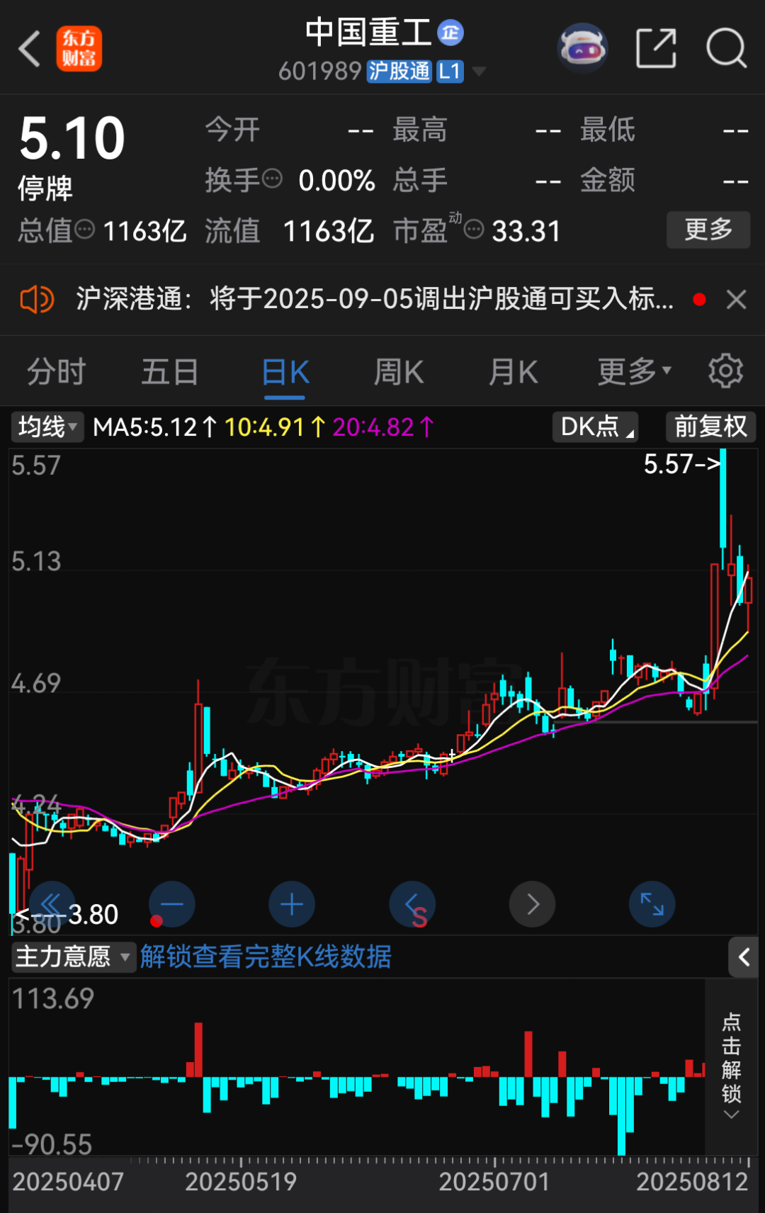 9月3日晚间,中国重工、中国船舶公告称,中国重工计划自9月5日起终止上市,换股实施股权登记日为9月4日,换股比例为1:0.1339,即每1股中国重工股票,转换为0.1339股中国船舶股票。 上述交易历经一年,即将进 ...