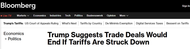 FX168财经报社 亚太 讯美国彭博社周三 9月3日 报道称 美国总统特朗普 DonaldTrump 暗示 如果美国司法系统最终裁定他的全球关税非法 那么与欧盟 日本和韩国等经济体的贸易协定将被取消 截图来源 彭博社 特朗普周三表 ...