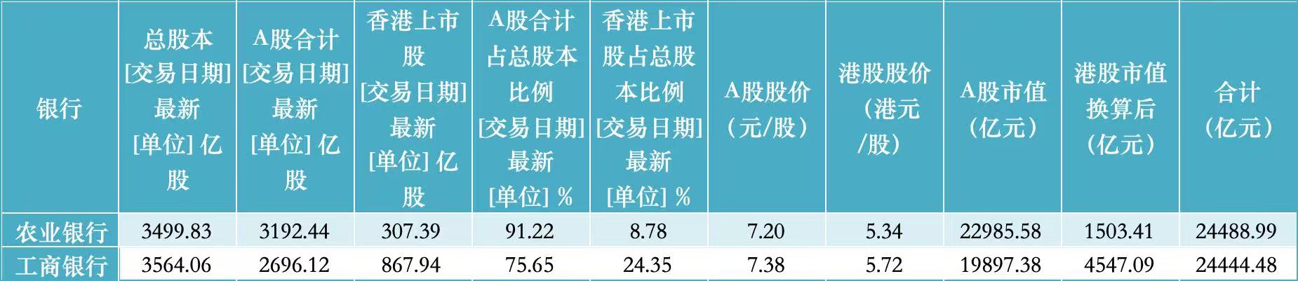 继8月上旬A股市值超过工商银行(601398.SH,01398.HK)之后,不足1个月时间内,农业银行(601288.SH,01288.HK)总市值首次超过工商银行,晋升为新“宇宙行”。 截至9月4日午间休盘,农业银行总市值接近2.45万亿元,略超过工商银行的2.44万亿元。 当日上午,农业银行A股股价上涨0.7%,报7.2元;工商银行A股股价下跌0.81%,报7.38元。港股市场上,农业银行、工商银行分别涨0.38%、跌0.35%,股价分别报5.72港元、5.34港元。 Wind最新数据显示,农业银行、工商银行总股本分别约为3500亿股、3564亿股。其中,A股股本占总股本比例分别在91%、76%左右,港股股本占比分别约为9%、24%。另从流通股占比来看,目前二者流通股占总股本比例均为100%。 ![]() (注:文中总市值计算口径为A股最新价×A股总股本+H股最新价×H股总股本×实时汇率;A股市值计算口径为A股最新价×A股总股本) (文章来源:第一财经) |