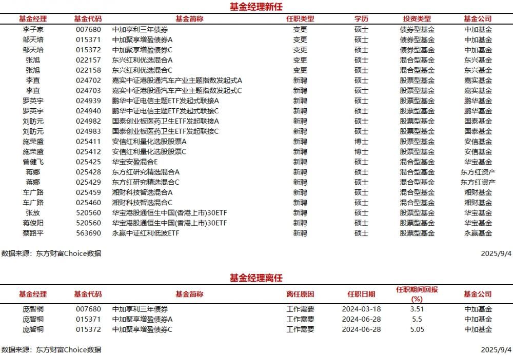 每经AI快讯,据东方财富Choice数据统计,今日新聘基金经理13人,涉及20只基金(A/C类分开计算),主要来自华宝基金、中加基金等公司。另外,今日有1位基金经理离任。 ![]() |