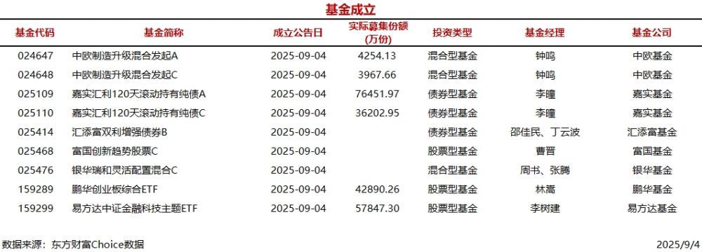 每经AI快讯,据东方财富Choice数据统计,今日共有9只基金公告成立(A/C类分开计算),包括3只股票型基金、3只混合型基金和3只债券型基金。