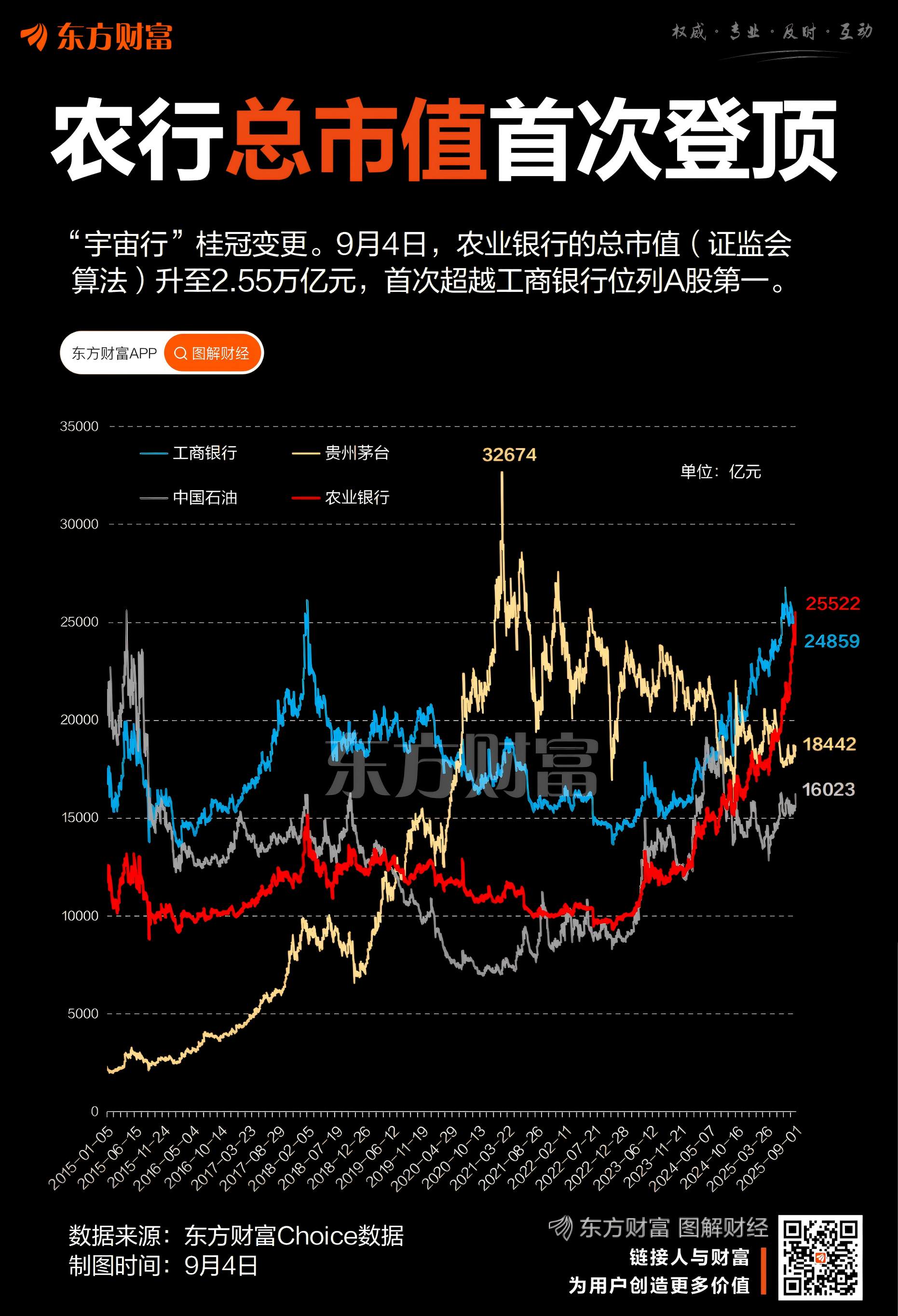 ![]() 农业银行总市值首超工商银行完成登顶,A股“宇宙行”桂冠变更。 9月4日,农业银行涨超5%再创历史新高,以证监会算法计算(A股市值+港股市值),农业银行总市值达2.55万亿元,首次反超工商银行的2.49万亿元。这也是继8月6日农行A股市值登顶后,不到一个月内完成的第二次反超。 今年以来,农业银行的股价表现相对工商银行更为强劲。据东方财富Choice数据,截至9月4日,农业银行A股年内涨幅已超47.1%。相较之下,工商银行A股年内涨幅约为13.5%。港股方面,农业银行H股今年涨幅超过29.3%,工商银行的H股涨幅则不足16.7%。 关于A股市值第一的争夺方面,数据显示,自2006年工商银行上市后,A股市值第一就只在工商银行、中国石油和贵州茅台三股之间进行变更,直到现在农业银行首次登顶才打破这一格局。 2006年10月,工商银行上市伊始就成为A股市值第一,直至次年11月中国石油上市才被超越。中国石油上市首日,盘中最高市值超8.8万亿元,而当日工行的总市值为2.6万亿元,中国石油上市首日即登顶。 此后多年中国石油股价持续走低,领先优势持续收窄,至2015年9月被工商银行反超,当时两者的市值均在1.5万亿元左右。贵州茅台当时的市值只有约2400亿元,但此后股价持续走强,2020年6月市值反超工商银行登顶A股时,贵州茅台的市值已涨至1.8万亿元。 2021年12月贵州茅台市值创下3.27万亿元的历史纪录后震荡回落,叠加2023年起银行股走高,此消彼长之下工商银行自2025年初开始坐稳A股市值第一。再到当前,农行市值首超工商银行登顶A股,成为了新“宇宙行”。 (文章来源:东方财富研究中心) |