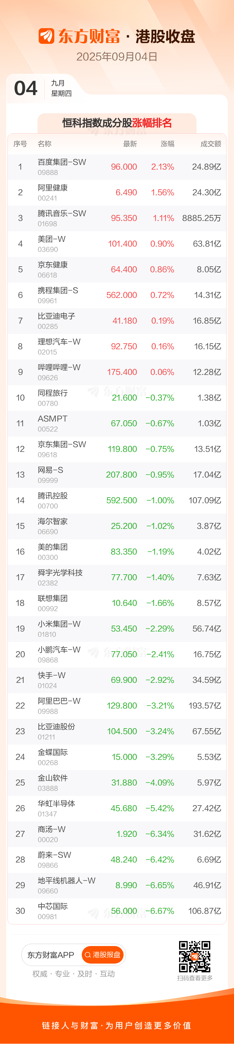 港股9月4日收盘走低,恒生指数收报25058.51点,跌284.92点,跌幅1.12%;恒生科技指数收报5578.86点,跌104.88点,跌幅1.85%。恒生指数成分股中百度集团-SW、信义光能、阿里健康涨幅居前,中升控股、药明康德、中 ...