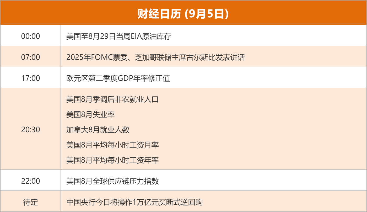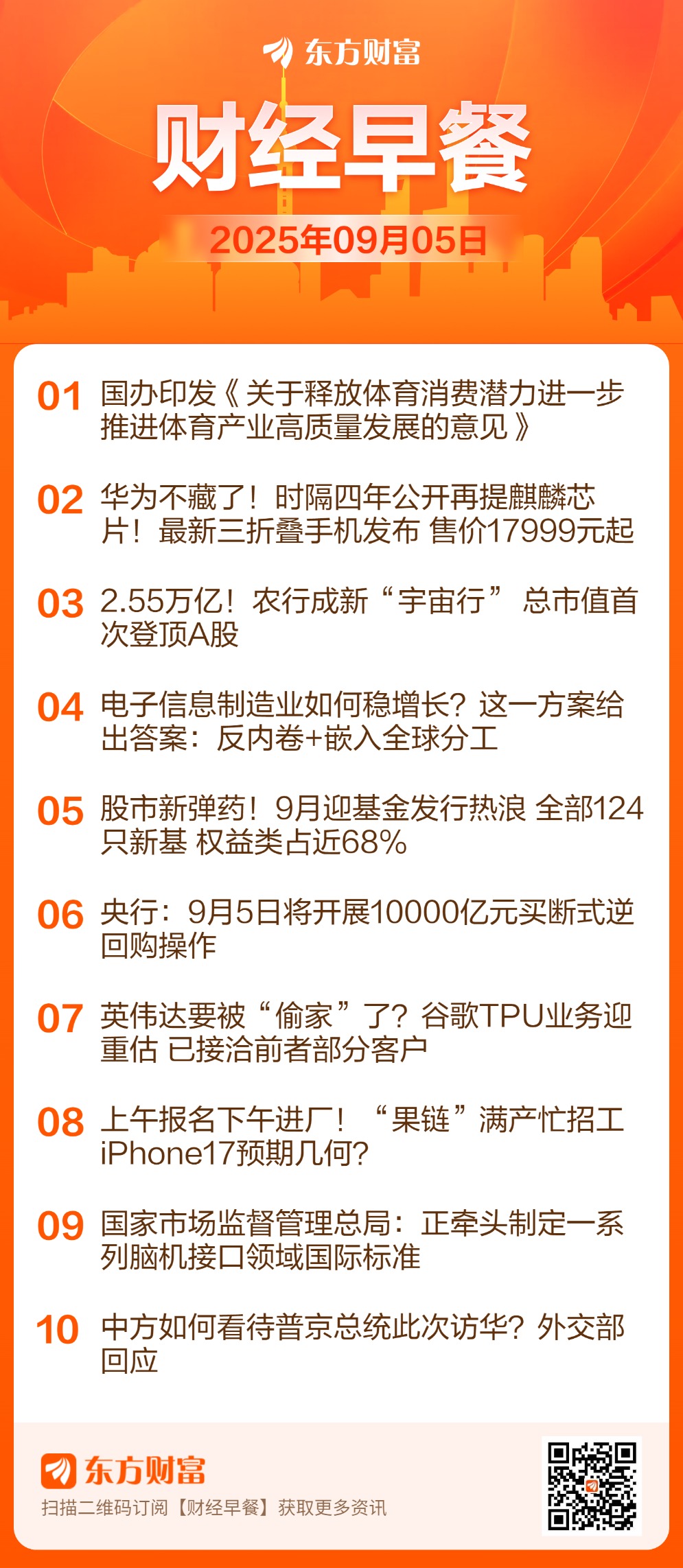 ![]() 每日精选体育产业: 国务院办公厅日前印发《关于释放体育消费潜力进一步推进体育产业高质量发展的意见》(以下简称《意见》)。《意见》提出到2030年,培育一批具有世界影响力的体育企业和体育赛事,体育产业发展水平大幅跃升,总规模超过7万亿元。《意见》强调,要丰富体育赛事活动,优化赛事服务管理,发展户外运动产业,培育壮大冰雪经济,推动体育用品升级。 麒麟芯片: 华为三折叠屏手机Mate XTs非凡大师正式发布,售价17999元起,将于9月12日正式开售。相较上一代三折叠屏19999元的起售价,降低了2000元。余承东在发布会介绍,Mate XTs采用HarmonyOS 5.1系统,搭载麒麟9020芯片,可以让操作更丝滑流畅,整机性能提升36%。这是华为时隔4年发布会再次公开提及麒麟芯片。 央行逆回购: 为保持银行体系流动性充裕,2025年9月5日,中国人民银行将以固定数量、利率招标、多重价位中标方式开展10000亿元买断式逆回购操作,期限为3个月(91天)。 农行登顶总市值榜首: 农业银行大涨超5%,单日涨幅创2023年5月以来近2年新高。目前,农业银行总市值升至2.55万亿元,首次超越工商银行(2.49万亿元),并成为A股“总市值冠军”。同时,农业银行年内总市值累计共增长7219亿元,增长规模也位居A股第一。 电子信息制造业稳增长: 9月4日,工业和信息化部、市场监督管理总局印发《电子信息制造业2025-2026年稳增长行动方案》,提出2025-2026年,规模以上计算机、通信和其他电子设备制造业增加值平均增速在7%左右,加上锂电池、光伏及元器件制造等相关领域后电子信息制造业年均营收增速达到5%以上。方案还提出综合整治“内卷式”竞争,深度嵌入全球电子信息制造业分工体系,促进国内外市场畅通经济循环。 基金发行热: 9月共有124只新基金开启发行,其中85只为权益类基金(不同份额分开计算),占比约68%。从基金主题来看,公募重点布局高端制造、人工智能、医药等领域,这些领域在9月均有多只基金开启发售。投资者认购基金的热情也高涨。招商均衡优选混合9月2日开售,开售首日就因认购金额超50亿上限而提前结募,成为9月首只“日光基”。尽管近期股市高位震荡,但业内认为对市场调整无需恐慌,且随着新基金发行、成立并建仓,市场也有望迎来增量资金。 IP经济: 9月4日,正值迷你版Labubu发布一周,记者发现,潮玩平台迷你版Labubu的二手价格开始下降,有黄牛表示“迷你版Labubu的价格后劲没有第三代Labubu足。”得物app平台数据显示,发布一周以来迷你版Labubu的成交单量已超过5.6万件,单个盲盒的近3日成交均价为138元,相较79元的原价仍溢价75%。但相较发售前期,Labubu迷你版的二手成交价已下降10%-60%。 印度税率: 当地时间周三深夜,印度财政部长西塔拉曼宣布,对印度国内从肥皂到小型汽车等数百种消费品减税,以刺激国内需求,抵御美国关税带来的经济逆风。印度商品和服务税(GST)小组批准降低多种日常用品的税率,并简化为5%和18%两种;降税举措将从9月22日起生效,预计印度国内消费有望提振,相关企业营收将增加。 热点题材文旅消费: 作为今年的最后一个长假,此次由国庆节与中秋节共同构成的八日连休假期,无疑将成为年度旅游市场的高峰期。截至9月1日,航旅纵横数据显示,今年中秋国庆假期国内航线机票预订量超208万张,日均机票预订量较去年同期增长约23%;出入境航线机票预订量超100万张,日均机票预订量较去年同期增长约17%。 光伏锂电: 工业和信息化部、市场监督管理总局日前联合印发的《电子信息制造业2025-2026年稳增长行动方案》,行动方案提到,在破除“内卷式”竞争中实现光伏等领域高质量发展,依法治理光伏等产品低价竞争。引导地方有序布局光伏、锂电池产业,指导地方梳理产能情况。实施光伏组件、锂电池产品质量管理,深入落实《光伏制造行业规范条件》等文件。 人形机器人: 继7月斩获近亿元的全球人形机器人企业最大单笔订单后,优必选再次刷新纪录,获得某国内知名企业2.5亿元具身智能人形机器人产品及解决方案采购合同,该合同以人形机器人WalkerS2(具备自主热插拔换电系统)为主,优必选将在今年内启动该合同交付。这也是截止目前全球人形机器人最大的合同。据公开数据统计,截止目前,优必选Walker系列人形机器人已获得近4亿元合同。此次的大合同将极大促进优必选提升人形机器人在真实场景的应用能力。 AI芯片: 当地时间9月3日,D.A. Davidson分析师Gil Luria在最新报告中指出,过去一年以来谷歌母公司Alphabet大幅缩小与英伟达的差距,如今已成为“最好的英伟达替代方案”。谷歌TPU的受关注度正在逐渐升温,谷歌TPU是谷歌自研的一款AI芯片,分析师与前沿AI实验室的研究人员和工程师交流后发现,业内普遍看好谷歌TPU。根据D.A. Davidson的DaVinci开发者数据集,今年2月至8月,谷歌云平台上围绕TPU的开发者活跃度增长了约96%。 无人驾驶: 特斯拉公司最新官宣,已向公众开放其自动驾驶出租车Robotaxi的应用程序,这意味着该公司很快将把这项服务推广给更多人群。而在此之前,该服务主要面向得克萨斯州奥斯汀市的早期测试用户。该公司旗下Tesla Robotaxi账号周四(9月4日)在社交媒体平台 X 上发布了一则消息,称这款应用程序“现已面向所有人开放”。 苹果产业链: 据记者了解,目前富士康、蓝思科技、立讯精密等果链企业工厂正大力招工。有人力中介告诉记者,目前上午