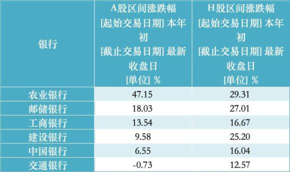 9月4日,A股市场骤然降温。全天最大看点之一在于,一边是前期活跃的科技股大面积下挫,另一边是银行股热度回升。 当天盘中,农业银行(601398.SH,01398.HK)总市值首次超越工商银行(601288.SH,01288.HK)晋升为新“宇宙行”。这也是继8月上旬A股市值超过工商银行之后,农业银行在不到一个月时间里创下的又一个纪录。 全市场来看,截至收盘,上证综指跌1.25%,报3765.88点;科创50指数跌6.08%,报1226.98点;深证成指跌2.83%,报12118.7点;创业板指跌4.25%,报2776.25点。 在此背景下,农业银行全天逆势大涨5.17%,总市值冲至2.55万亿元,较工商银行高出660多亿元,正式拿下总市值冠军宝座。今年以来,农业银行股价持续拉升,以47%涨幅在上市银行中领跑,总市值暴增7200多亿元,相当于“涨出”一个中国神华。 ![]() 农业银行总市值超过工商银行 在指数全线回落背景下,周四全市场2990只个股下跌,2297只个股上涨。板块表现方面,科技股大面积下挫,CPO(共封装光学)指数跌幅超10%,芯片、小金属、军工板块同步杀跌,商贸零售、美容护理、银行分别以1.63%、1.19%、0.79%涨幅位列31个申万一级行业前三。 “跷跷板”效应下,午后银行板块持续走强。在上午逆势上涨并实现总市值登顶之后,午后农业银行继续走强,尾盘大幅拉升,股价一度触及7.55元的新高,收盘涨幅回落至5.17%,报7.52元。其他大行中,邮储银行收涨2.9%,工商银行、中国银行也分别上涨1.34%、1.26%。截至收盘,共有24只银行股飘红,板块总市值约为14.64万亿元。 当天最大的看点在于,随着股价逆势上行,农业银行不仅A股市值较工商银行距离拉大,总市值也首度超过工商银行,正式成为新“宇宙行”。 截至收盘,农业银行总市值已超过2.55万亿元,较工商银行(2.49万亿元)高出667亿元。A股最新总市值排名显示,排在前五位的分别是农业银行、工商银行、建设银行、贵州茅台、中国移动。年初时TOP5名单则为:工商银行、贵州茅台、农业银行、中国移动、中国石油。 从市值变化来看,年初以来,农业银行总市值已增长约7219亿元,位列A股首位。这一市值增量,相当于一个中国神华(7386亿元),两个中国人保(3539亿元)。 回顾来看,尽管7月以来银行板块有所回调,但大行之间表现分化,农业银行股价表现相对稳健,年内A股股价累计涨幅超过47%。其他国有大行中,工商银行、邮储银行A股股价分别累计上涨13.54%、18.03%,建设银行、中国银行涨幅分别为9.58%、6.55%,交通银行则跌了0.73%。 除农业银行、邮储银行外,年内涨幅靠前的银行股以城商行、股份行为主。其中,青岛银行(39.88%)、浦发银行(37.88%)分别位列涨幅第二、第三。同期,华夏银行、郑州银行跌超2%。 不过,从股本分布来看,大行之间差异较大,这也成为此前大行A股市值PK的争议点所在。Wind最新数据显示,国有大行A股合计占总股本比例由高到低分别是:农业银行(91%)、邮储银行(83%)、工商银行(76%)、中国银行(74%)、交通银行(60%)、建设银行(8%);六大行香港上市股占总股本比例由高到低分别是建设银行(92%)、交通银行(40%)、中国银行(26%)、工商银行(24%)、邮储银行(17%)、农业银行(9%)。 其中,农业银行、工商银行总股本分别约为3500亿股、3564亿股,目前二者流通股占总股本比例均为100%。 港股市场上,农业银行同样涨幅领先。WIND数据显示,年初至今,农业银行、邮储银行、建设银行H股股价分别上涨29.31%、27.01%、25.20%;工商银行、中国银行、交通银行年内H股涨幅分别为16.67%、16.04%、12.57%。 如何解释背后力量和逻辑 此轮银行股行情中,国有大行的表现一直是亮点。因为市值盘子较大,背后资金力量一直备受关注,相关猜测包括险资加仓、公募基金增配、居民存款搬家等。 有资深投资人士对第一财经表示,上述资金力量都有参与其中。但银行股作为高股息红利股的代表,过去估值一直被低估,配置型资金和交易型资金对此类资产的布局时点差异很大,会造成交易筹码在估值足够低时向配置盘集中,待漫长熊市结束迎来上涨行情,市场上买盘很多、卖盘很少,出现价值爆冲现象。 近期,面对科技股热潮重来,银行股已经历一定幅度回调,加上前期板块涨幅较大,关于银行股行情是否已告一段落的讨论增多。不过,上述投资人士表示,判断银行股贵不贵的关键是估值,短期涨跌幅参考意义不大。 从配置盘力量来看,今年以来最受关注的一股力量是险资,后者年内频频“扫货”银行股。以平安人寿为例,据记者不完全统计,公司今年频频在港股市场增持招商银行、农业银行、邮储银行、工商银行等,多次触发举牌。当前,平安人寿所持上述四家银行的H股股份比例均在15%以上。其中,平安人寿最近一次公告举牌农业银行H股是在9月2日。 从A股估值来看,截至9月4日收盘,42家A股上市银行中,仅招商银行市净率(PB)在1倍以上,农业银行、成都银行分别以0.98倍、0.93倍位列第二、第三。从AH股溢价率来看,随着港股股价上涨,除农业银行AH股溢价率由年初的30%左右上升至52%、工商银行AH股溢价率略增1个百分点外,其余两地上市银行股AH股溢价率均有不同程度下行。 前述投资人士认为,港股内银股的吸引力的确有所下降,但估值还不贵;A股银行股整体依然比港股更贵,但差距在缩小,这也会使得部分机构的目光开始从港股转向A股。 股息率方面,截至周四收盘,42家A股上市银行的股息率中位数仍在4%以上。随着半年报披露,多家银行的中期分红方案也出炉,其中6家国有大
