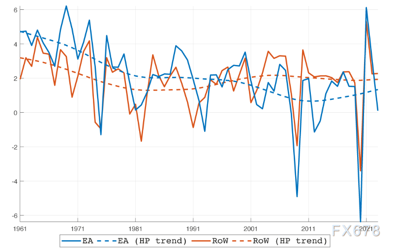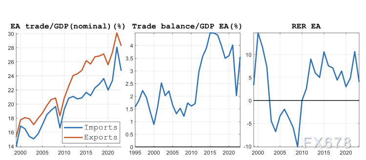 研究表明,欧元区相较于世界其他地区(以下简称“其他地区”或ROW,restofworld)的持续性生产率增长差异,是欧洲外部顺差的核心驱动因素。而贸易结构的结构性变动——如本土偏好下降(即欧元区购买本地生产商品的倾向)、进口价格走低等——则抵消了生产率增长差距所引发的升值压力。 ![]() 21世纪初以来,欧元区始终面临持续性的增长困境。该地区的产出与生产率增长,始终落后于美国、中国等全球竞争对手。同期,欧元区却维持着持续贸易顺差,其规模平均占其国内生产总值(GDP)的2.6%。 1999年至2023年间,欧元区实际GDP年均增长率仅为1.26%,而其他地区这一指标则达到3.28%。劳动生产率增长(以劳动力人均GDP衡量)的差距同样显著:欧元区年均增长率为0.70%,其他地区则为1.95%(图1)。这种差异并非短期现象:增长差距具有高度持续性,且预计仍将延续。 ![]() 在此期间,该地区贸易开放度不断提升,但实际汇率(RER)亦无明显趋势。部分观点认为,欧元区贸易顺差为正,反而反映出了其国内需求不足,尤其是投资疲软。 所以不能通过长期的贸易顺差证明欧洲经济的实力,德拉吉(2024年)提出,单一市场一体化程度不足与资本市场深度欠缺抑制了投资活动,导致增长向外部需求倾斜,并维系了贸易顺差格局。 关于欧元区失衡的现有长期文献,大多聚焦于欧元区内部的调整问题,多项研究指出,在解释欧元区需求疲软(尤其是金融危机与主权债务危机之后)的成因时,资源错配与金融市场缺陷起到了关键作用。 出现了新的对于贸易顺差现象研究的框架 在一项最新研究中通过摒弃“经济的外部冲击具有暂时性”这一普遍假设,该分析框架对外部调整的长期驱动力进行了量化测算。 其核心结论是:欧元区生产效率增速持续低于其他地区,是贸易顺差的核心驱动因素。而贸易结构冲击——尤其是欧元区本土偏好下降与进口价格走低——同样发挥关键作用,抵消了实际汇率面临的升值压力。 研究结果表明,欧洲持续贸易顺差与投资疲软,不仅源于其国内需求状况,还与长期存在的生产率差距及全球贸易的结构性变革密切相关。分析支持近期有关重启改革、以提升生产率并增强该地区应对全球冲击韧性的呼吁。 欧元区实际汇率下行意味着欧元升值。实际汇率以相对GDP平减指数为衡量基准,并以与2010年水平的百分比偏差形式呈现。 ![]() 这些现象引发两个关键问题,一是欧元区贸易顺差在多大程度上由生产率增长疲软所致,二是为何在生产率差异持续存在的情况下,实际汇率仍能保持稳定。 为解答这些问题,整个研究利用1999年至2023年欧元区与其他地区的数据,该分析框架的核心创新点在于对趋势性冲击的明确建模。 此研究利用经估算的模型,对关键宏观经济变量进行历史冲击分解。在估算的模型中,欧元区实际GDP的持续疲软,主要由一系列欧元区生产率增长的负面冲击导致,而其他地区的强劲增长则进一步加剧了这一态势。趋势增长路径的分化,是两个地区之间持续存在产出与收入差距的重要原因。 新分析框架揭示了欧元区长期顺差的秘密 我们的历史分解结果显示,周围国家相对欧元区生产力的提升对欧元区贸易顺差的贡献占比介于1/4至1/2之间。 欧元区以外其他地区出现生产力提升,会推升其企业与人民未来收入与财富水平,进而促使家庭与企业增加在欧洲以及其他地区国家的消费和投资。 这会暂时拉动其他地区对欧元区出口的需求,同时降低其他地区的储蓄水平。欧元区增长冲击的负面影响对贸易差额产生的效应,即欧元区生产率疲软会压低预期收益与投资规模,引发资本外流,并抑制进口。 因此,欧元区长期保持贸易顺差的秘密在于,国外生产力提升增加了国外兑欧元区商品的购买,而欧元区经济增长缓慢,人们收入增长缓慢则抑制了居民与企业的对外的消费意愿因为消费是收入的函数C=F(Y),最终欧元区对外长期处于贸易顺差。 长期顺差促进欧元升值,但为何实际汇率却变化不大? 货币升值会影响贸易条件,让进口产品相对更便宜,但出口产品变贵。所以实际汇率变动对一国外贸有重大的影响。 标准理论预测,其他地区趋势性生产率增长加快,应会导致欧元区实际汇率(实际汇率(ε)=名义汇率(E)×(外国价格水平/本国价格水平)出现趋势性升值。 但数据显示,实际汇率(在中期维度上)相当“平稳”。这一看似矛盾的现象可通过贸易结构性变动来解释:欧元区进口价格(尤其是非大宗商品进口价格)的趋势性下行,反映出其他地区可贸易部门(尤其是中国及其他新兴市场国家)的生产率增长加快。 这一变化降低了欧洲家庭与企业面临的外国商品相对价格,提升了欧元区的进口份额,并缓解了实际汇率面临的升值压力。 与此同时,欧元区的本土偏好出现长期下降,消费者对外国商品的偏好增强,欧元区生产商在其国内市场的份额亦有所流失。这些发展趋势之间可能存在关联:其他地区可贸易部门生产率提升的同时,其产品质量与种类也得到改善,进一步加剧了进口渗透态势。 最后,该模型还揭示了欧元区投资不足的外部决定因素。其他地区的正向生产率冲击不仅会推动外国吸收增加(Y=A(吸收)+(X-M)即外国经济体在其本国的消费增加),还会推高全球利率与外国相对收益率。 在金融开放的背景下,这些变化会削弱欧元区内部的投资动机,并挤出其国内吸收。因此,欧元区投资的持续疲软,不仅反映其
