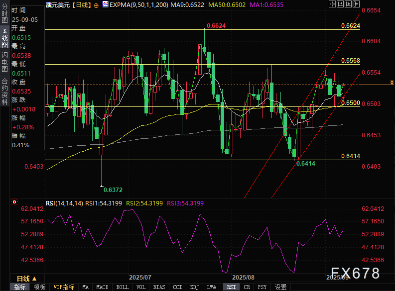 周五(9月5日)澳元兑美元收复失地,扭转前一交易日跌势,日内呈震荡上涨态势,目前交投于0.6530附近,涨幅0.23%,短期维持看涨倾向。由于美国就业数据不及预期令美元承压,澳元兑美元稳步上行。 ![]() 美元指数正回吐近期涨幅,现交投于98.10附近。根据CME FedWatch工具显示,市场对美联储9月政策会议降息25个基点的定价概率已超过99%,较一周前的87%显著上升。 截至8月30日当周,美国初请失业金人数升至23.7万,高于前值22.9万,也超出市场预期的23万。周四ADP就业数据显示,8月就业人数增加5.4万,低于预期的6.5万,且较7月修正后的10.6万(原值10.4万)显著放缓。 澳元全线走强主要得益于7月贸易顺差扩大及第二季度GDP数据稳健,这缓解了市场对澳洲联储(RBA)进一步降息的预期。利率互换合约显示,市场预计澳洲联储9月下旬维持政策不变的概率已接近90%。 澳元走强,降息预期降温提振汇率 澳大利亚统计局(ABS)数据显示,7月贸易顺差大幅升至73.1亿澳元(前值上修至53.66亿),远超降至49.2亿的市场预期,出口环比增长3.3%(前值6.3%),进口下降1.3%(前值降1.5%),共同推动顺差扩张。 周三公布的GDP数据同样强劲:第二季度季调后GDP环比增长0.6%(前值0.3%),高于0.5%的预期;同比增长1.8%(前值1.4%),超出1.6%的共识预期。 更关键的是,7月CPI同比上涨2.8%,显著高于前值1.9%和预期2.3%,这彻底浇灭了市场对澳洲联储近期降息的预期,持续为澳元提供支撑。 中国财新服务业PMI8月意外升至53.0(前值52.6),制造业PMI跃升至50.5(前值49.5),双双超预期。鉴于中澳紧密的贸易伙伴关系,中国经济形势变化将继续显著影响澳元走势。 美国方面,JOLTS职位空缺数7月降至718万(前值735万),创2024年9月以来新低且不及740万预期。明尼阿波利斯联储主席卡什卡利警告称关税正推高消费品成本并加剧通胀,亚特兰大联储主席博斯蒂克则强调高通胀仍是主要风险,但劳动力市场疲软迹象仍支持年内降息一次。 财政部长贝森特预计最高法院将批准特朗普援引1977年《紧急权力法》对贸易伙伴加征关税,并表示政府已准备备用方案,特朗普已承诺寻求法院“加速裁决”。 澳元兑美元自0.6500关键支撑区域反弹 日线图技术分析显示,澳元兑美元日内波动区间底部位于上升通道模式的下轨边界,后续走势将提供明确方向指引。 当前汇价略高于9日指数移动平均线(EMA)(0.6522),表明短期价格动能仍偏强。 与此同时,14日相对强弱指数RSI高于中线水准,也验证了短期看涨可能。 上行方向,澳元兑美元可能上探8月14日创下的五周高点0.6568,随后挑战0.6600附近的上升通道上轨,若突破通道上轨,将强化看涨倾向,推动汇价测试7月24日创下的九个月高点0.6624。 下行方向,该货币对近期支撑位于9日EMA(0.6522),该点位与上升通道下轨重合。下方50日EMA(0.6502)构成第二道防线,若有效跌破该关键支撑区域,将引发看跌情绪,可能导致汇价下探8月21日创下的三个月低点0.6414。 ![]() 北京时间15:22,澳元兑美元交投于0.6534/35。 ![]() |