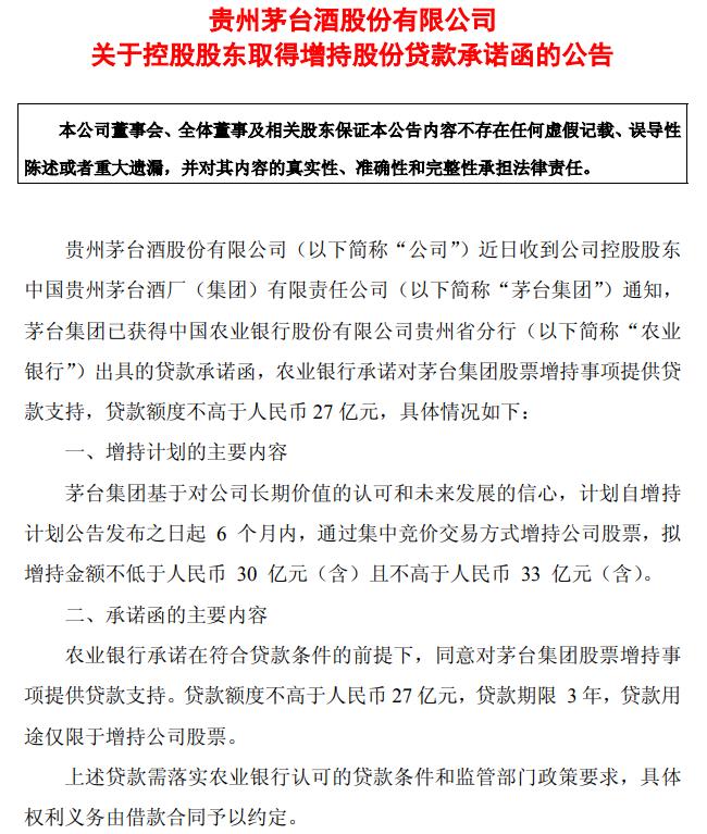 贵州茅台9月5日公告,公司控股股东中国贵州茅台酒厂(集团)有限责任公司已获得中国农业银行股份有限公司贵州省分行出具的贷款承诺函,承诺对茅台集团股票增持事项提供贷款支持,贷款额度不高于人民币27亿元。增 ...