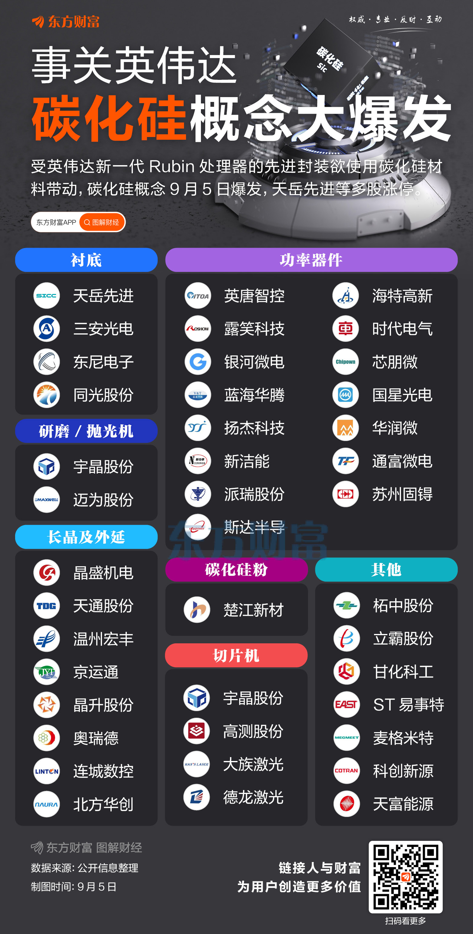 碳化硅概念在9月5日表现强势,指数大涨5.76%,板块中天岳先进、露笑科技、天通股份涨停;晶盛机电、英唐智控大涨超10%。 消息面上,据每日经济新闻报道,为提升性能,英伟达在新一代Rubin处理器的开发蓝图中 ...