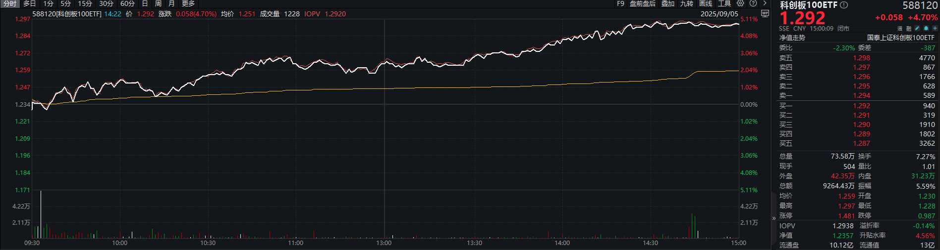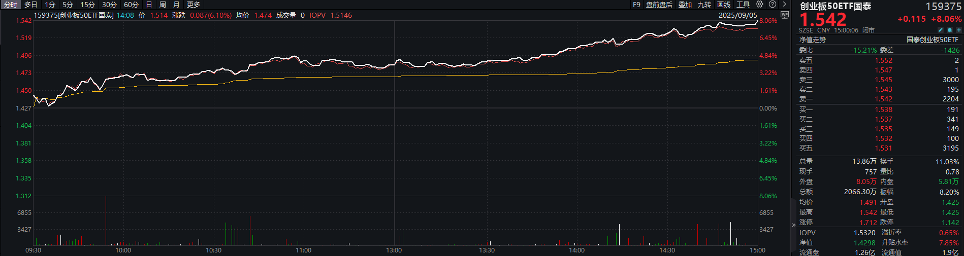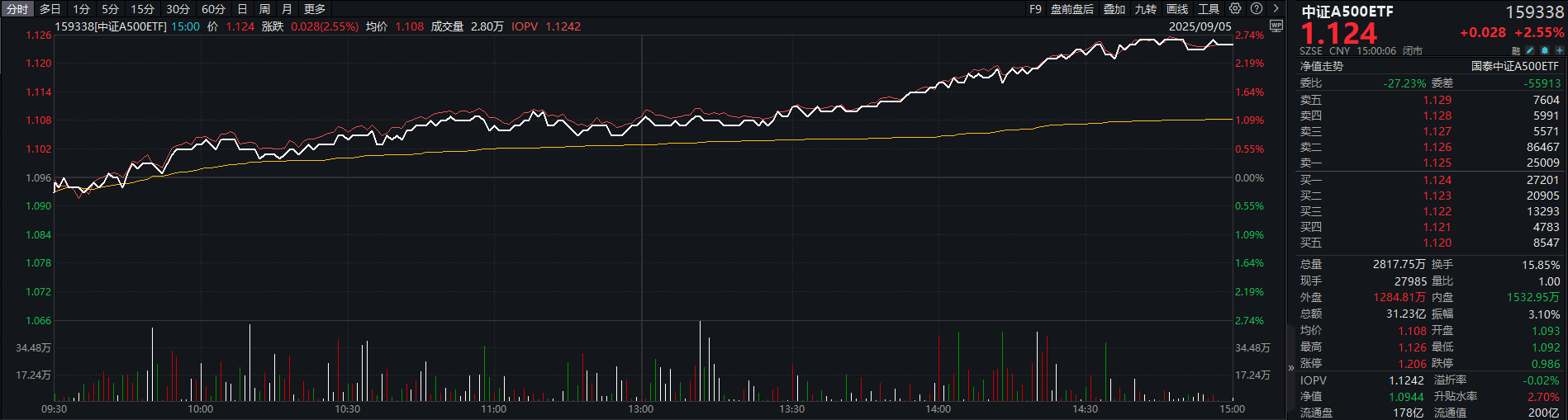 每经编辑|彭水萍 9月5日,A股三大指数集体收涨,截至收盘,上证指数涨1.24%,深成指涨3.89%,创业板指涨6.55%。全市场成交额2.35万亿元,较上个交易日缩量2335亿。 中证A500ETF(159338)收涨2.55%,创业板50E ...