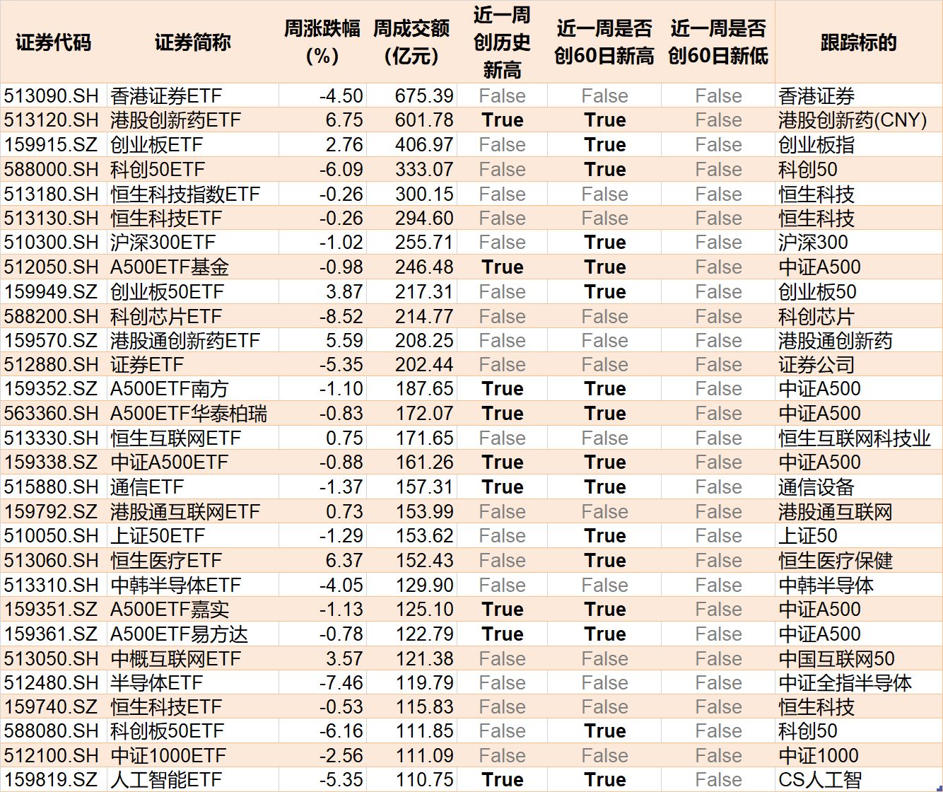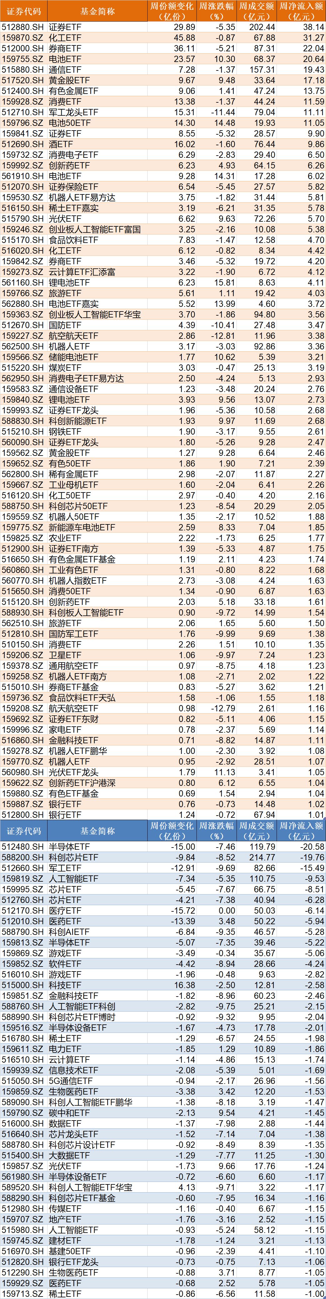 每经记者|叶峰 每经编辑|赵云 本周股指集体调整,沪深两市股票型ETF和跨境型ETF合计净流入约128亿元。 从行业主题上看,证券、化工、电池等ETF被资金看好,而芯片相关ETF被资金抛售。 逾百亿元资金借道ETF进场 本周沪深两市成交12.84万亿元,其中沪市成交5.53万亿元,深市成交7.31万亿元。截至最新收盘,沪指报收于3812.51点,全周下跌1.18%,深证成指报收于12590.56点,全周下跌0.83%。 本周主要指数相关ETF表现 本周市场主要股指集体调整,规模较大的ETF中,科创50ETF、科创板50ETF跌超6%。 Wind数据显示,上述10只指数ETF本周合计净流出111.08亿元,其中创业板ETF净流出42.01亿元。 总体而言,本周沪深两市股票型ETF和跨境型ETF合计净流入约128亿元。 有券商表示,对于市场中期趋势,仍维持偏乐观的观点。后续市场可重点观察以下几个关键变量:宏观经济数据的改善力度、海外市场环境尤其是美联储货币政策转向的时点和幅度变化、半年报业绩披露后机构的调仓方向及成交量能变化。 证券、化工、电池等ETF净流入资金居前 在行业主题ETF方面,本周净流入资金超1亿元的基金有75只,其中证券ETF、化工ETF和券商ETF分别增加了29.89亿份、45.88亿份和36.11亿份,净流入资金38.14亿元、31.27亿元和22.04亿元。 在资金流出方面,本周有43只行业主题ETF净流出逾1亿元,其中半导体ETF、科创芯片ETF和军工ETF份额分别减少15亿份、9.84亿份和12.91亿份,分别净流出资金20.58亿元、19.76亿元和15.49亿元。 值得注意的是,证券、化工、电池相关ETF本周获资金大幅买入,基金份额均创近一年新高。 证券ETF(512880)市场走势及份额变化 有机构表示,年初以来权益市场持续向上,但券商指数修复不及大盘,大券商估值仍处于历史中低位。当前权益资产收益率稳定向上,股票成交额、两融持续突破,券商经营进入强修复新阶段,看好券商业绩增长、估值修复的持续性。 电池ETF(159755)市场走势及份额变化 有券商表示,2025年以来,固态电池技术持续获突破,多家车企计划于2027年左右开始搭载全固态电池,行业产业化进程加快。随着中试线的陆续落地以及锂电扩产周期的重启,设备企业基本面有望持续改善,继续看好固态电池产业化推进。 29只ETF周成交额超100亿元 本周,股票型ETF和跨境型ETF成交额超100亿元的ETF有29只。 其中,香港证券ETF、港股创新药ETF周成交额超600亿元。 此外,多只中证A500相关ETF本周二级市场价格创上市新高。 有券商表示,中期来看,在国内经济基本面温和修复、政策面持续发力、资金面维持宽裕以及海外贸易扰动暂时平稳落地的背景下,继续维持指数震荡偏强运行、积极参与市场的判断。 2只ETF下周上市 基金重仓股向来是投资者关注的热点,但是主动管理型基金的重仓股浮出水面,通常都有一定的滞后性,而ETF布局的标的却是非常明确的,通过跟踪新上市ETF,通常可以发现近期热点个股,新上市ETF带来的增量资金也值得关注。 目前有2只ETF披露下周上市,跟踪标的为创业板50、金融科技等。 目前有4只ETF披露下周发行,跟踪标的有科创板200、农牧渔、上证380和民企300等。 封面图片来源:每日经济新闻 |