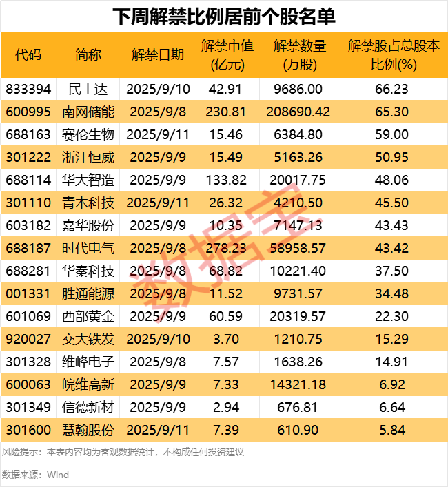 下周A股解禁市值逾960亿元。 9月5日晚间,*ST紫天(300280)发布公告,公司于9月5日收到深交所下发的《关于福建紫天传媒科技股份有限公司股票终止上市的决定》,深交所决定终止公司股票上市交易。 公司股票于9月15日复牌并进入退市整理期,退市整理期为十五个交易日,预计最后交易日期为2025年10月13日。公司股票于退市整理期届满的次一交易日摘牌并终止上市。 根据深交所下发决定:2025年5月20日,*ST紫天因财务会计报告存在虚假记载,被中国证监会责令改正但未在要求期限内完成整改,且在股票停牌两个月内仍未完成整改,股票交易被实施退市风险警示;自被实施退市风险警示之日起的两个月内,*ST紫天仍未披露经改正的财务会计报告,触及股票终止上市情形。 8月22日,证监会对*ST紫天下发行政处罚决定书,查实公司在2022年至2023年期间,通过多种手段连续两年虚增收入合计24.99亿元,涉及三份定期报告的造假行为。 下周A股解禁市值逾960亿元 据证券时报·数据宝统计,下周(9月8日至12日),A股市场将有40股迎来限售股解禁。以个股最新价计算,40股解禁市值合计高达966.01亿元。 从解禁规模来看,12股解禁市值超过10亿元。时代电气、南网储能、华大智造3股解禁市值逾100亿元,依次为278.23亿元、230.81亿元、133.82亿元;华秦科技、西部黄金下周解禁市值均超60亿元;从解禁类型上来看,南网储能、西部黄金为定向增发机构配售股份解禁;其余3股为首发原股东限售股份解禁。 ![]() 时代电气本次解禁的股东是第一大股东中车株洲电力机车研究所有限公司,解禁股份约为5.9亿股,占总股本比例43.42%。公司2025年上半年实现营业收入122.14亿元,同比增长17.95%;归母净利润16.72亿元,同比增长12.93%。 13股解禁比例高于10% 相较于市值规模,解禁比例(解禁股数量占总股本比例)更能反映出解禁对于个股股价的冲击。在上述40股中,共计13股解禁比例高于10%。民士达、南网储能、赛伦生物、浙江恒威解禁比例均高于50%。 ![]() 民士达是北交所上市公司。公司上半年实现营业收入2.37亿元,同比增长27.91%;归母净利润6302.78万元,同比增长42.28%。 银河证券指出,民士达主营产品芳纶纸技术壁垒高,盈利能力较好,随着行业国产化替代进程加快和新兴领域及中高端市场需求逐步扩大,将持续为公司贡献业绩增量,RO膜基材等新产品布局有望打造公司的第二增长曲线。 在解禁类型为定向增发机构配售股份的个股中,粗略计算,参与投资西部黄金、南网储能、科瑞技术、皖维高新、实达集团、国联民生的机构本次解禁收益率为正。其中,西部黄金收益率高于180%;南网储能收益率高于70%;科瑞技术收益率高于50%。 在下周40只解禁股中,有15股解禁类型为股权激励一般股份或限售股份。这15股中,三一重能、兆易创新、铂力特、润欣科技、海信视像解禁市值超1亿元。 (文章来源:证券时报网) |
