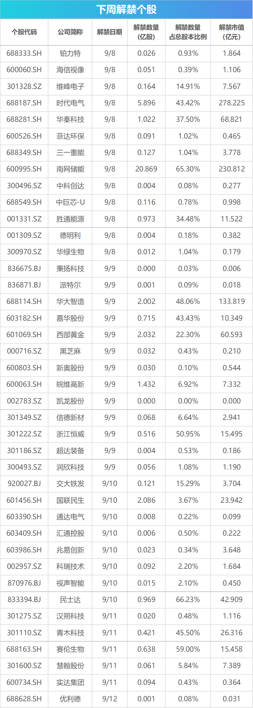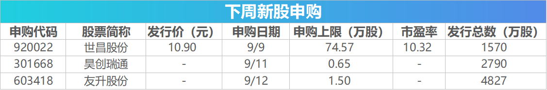 【重磅新闻】 8月CPI、PPI数据将发布 9月10日,国家统计局将发布居民消费价格指数月度报告和工业生产者价格指数月度报告。此前数据显示,7月份,全国居民消费价格同比持平,环比上涨0.4%。7月份,全国工业生产者出厂价格同比下降3.6%,环比下降0.2%。 成品油将迎调价窗口 根据“十个工作日”原则,本轮调价窗口为9月9日24时。据金联创测算,截至9月5日第八个工作日,参考原油品种均价为66.06美元/桶,变化率为1.52%,对应的国内汽柴油零售价应上调75元/吨。 2025苹果秋季新品发布会将举办 苹果将于北京时间9月10日凌晨1时举办秋季新品发布会,据悉,苹果将推出iPhone17系列,预计包括标准版、Pro版、ProMax版,以及Air版共四款机型。 科创板指数将进行2025年三季度调样 根据指数编制规则,科创50等科创指数样本每季度进行定期调整,本次调整将于9月12日收市后实施。生益电子将被调入科创50指数,埃夫特、中科蓝讯等5只证券将被调入科创100指数。调整后,科创50指数总市值3.1万亿元,覆盖率38.9%。科创100指数总市值1.9万亿元,覆盖率24.4%。科创50、科创100、科创200总市值覆盖率达84.6%,较调样前提升0.5个百分点。 泡泡玛特等公司被纳入恒生指数成分股 9月8日,恒生指数成分股调整将正式生效,恒生指数成分股数量将由85只增加至88只,恒生指数纳入中国电信、京东物流、泡泡玛特。另外,恒生生物科技指数、恒生综合指数等均有重大调整,所有变动将于9月8日起生效。 中证指数有限公司将发布多条新指数 中证指数有限公司将于9月10日正式发布2条指数,分别为中证A500成长指数和中证A500价值指数。中证指数有限公司将于9月11日正式发布4条指数,分别为中证A500相对成长指数、中证A500相对价值指数、中证A500纯成长指数和中证A500纯价值指数。 2025 Inclusion·外滩大会等多个重要会议将举行 2025 Inclusion·外滩大会将于9月10-13日举行,主题为“重塑创新增长”,覆盖金融科技、人工智能、云计算。2025年服贸会将于9月10日至14日在北京首钢园区举办。9月8日至11日,第二十五届中国国际投资贸易洽谈会将在福建省厦门市举办。2025广东国际旅游产业博览会将于9月12日至14日在广州启幕,汇聚全球近50个国家和地区的参展机构、超100个优质旅游目的地及500余家文旅企业参展。 逾966亿元市值限售股解禁 Wind数据统计显示,下周(9月8日至12日)共有40家公司限售股陆续解禁,合计解禁40.8亿股,按9月5日收盘价计算,解禁总市值为966.01亿元。其中,时代电气限售股解禁市值达278.23亿元,南网储能限售股解禁市值达230.81亿元。 ![]() 【新股机会】 下周将有3只新股发行 Wind数据显示,下周将有3只新股发行。世昌股份将在9月9日发行,本次发行价格为10.9元/股;昊创瑞通、友升股份分别于9月11日和9月12日发行。 ![]() (文章来源:第一财经) |