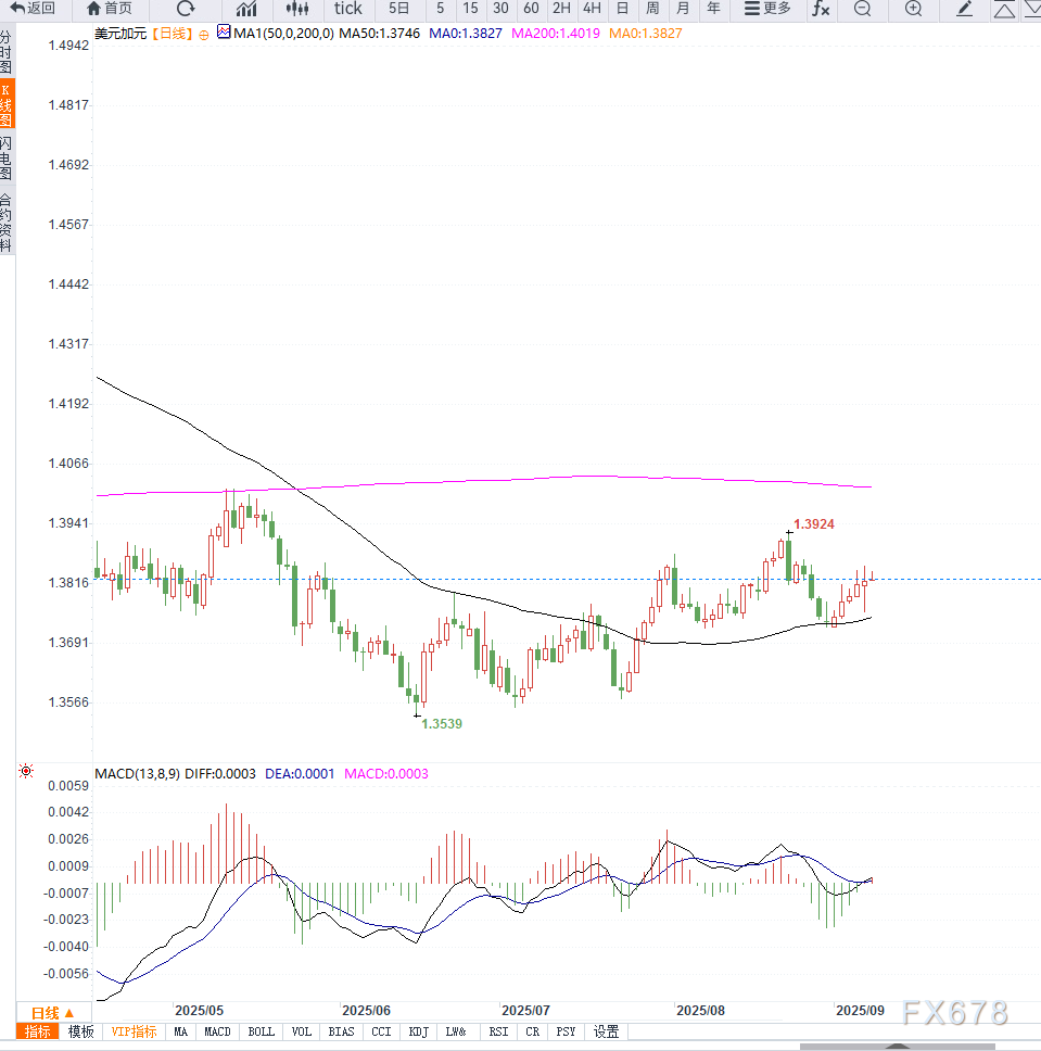 美元兑加元在亚洲时段继续上行,目前交投于1.3840附近,实现连续六个交易日上涨。美元反弹主要受到加元走弱支撑,但美联储降息预期可能限制美元进一步升值。 ![]() 加拿大8月就业人数意外下降6.55万,市场原本预期增加0.75万。7月就业减少4.08万,连续两个月萎缩。失业率升至7.1%,高于前值6.9%。 就业市场疲弱加大了市场对加拿大央行进一步宽松的预期,从而施压加元,助推美元兑加元上行。 从日线图来看,USD/CAD在1.3800-1.3840区域获得支撑,短期均线呈上行趋势,但上行动能略显有限。RSI接近超买区,提示短期涨幅可能放缓 若突破1.3860阻力,可能进一步上探1.3900;下方支撑位在1.3800和1.3750,一旦跌破或触发回调。整体短期偏向震荡上行。 ![]() ![]() |