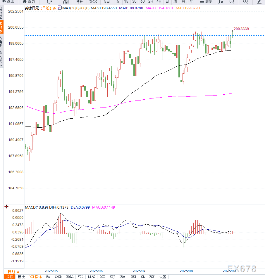GBP/JPY在周一亚洲时段开盘跳空上涨,触及200.35高点,随后回落至200.00附近,日内仍上涨逾0.40%。日元整体疲软为汇价提供上行动力,但英镑承压,涨幅受限。 ![]() 这为市场对日本央行(BoJ)年内加息预期提供支持,从而限制日元过度贬值。美日最新贸易协议也将降低日本关税,利好经济基本面,但政治因素仍对短期汇价构成扰动。 英镑面临国内财政不确定性压力,市场关注11月秋季预算案的公布。尽管英国央行因通胀顾虑采取谨慎降息策略,英镑仍受到美元走强拖累,限制GBP/JPY进一步拉升。 从日线图来看,GBP/JPY短期上行突破200.00心理关口,但日内高点200.35遇阻。若站稳200.50-201.00区间,有望进一步测试7月高点201.50附近; 下方支撑位在199.20-199.00及198.50,跌破则可能回调至197.80。RSI指标显示短期略偏强,但多空仍存分歧。 ![]() ![]() |