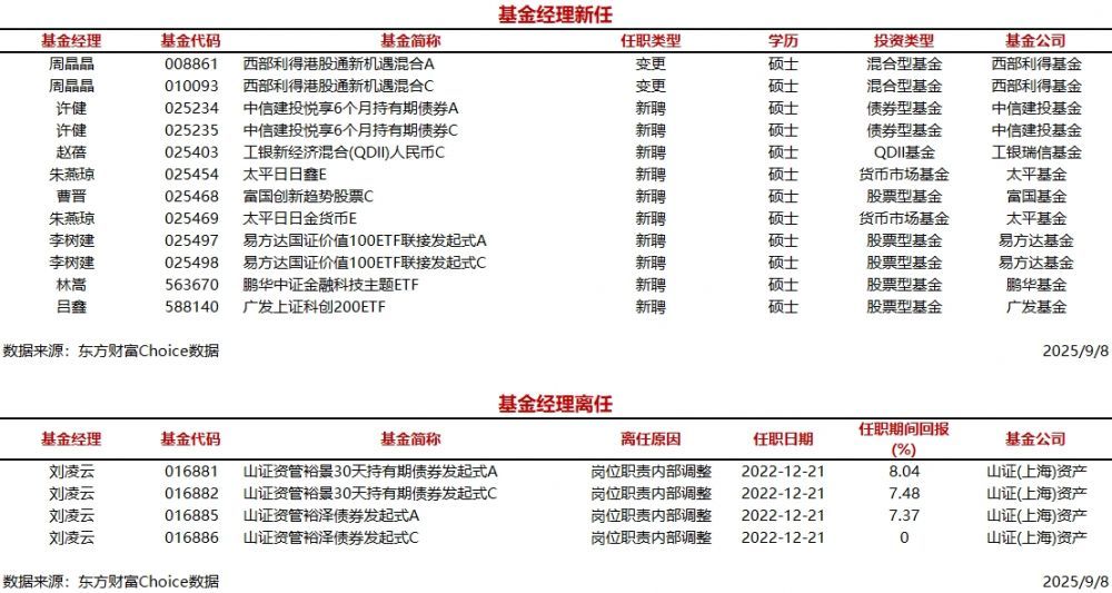每经AI快讯,据东方财富Choice数据统计,今日新聘基金经理8人,涉及12只基金(A/C类分开计算),主要来自易方达基金、西部利得基金等公司。另外,今日有1位基金经理离任。 ...