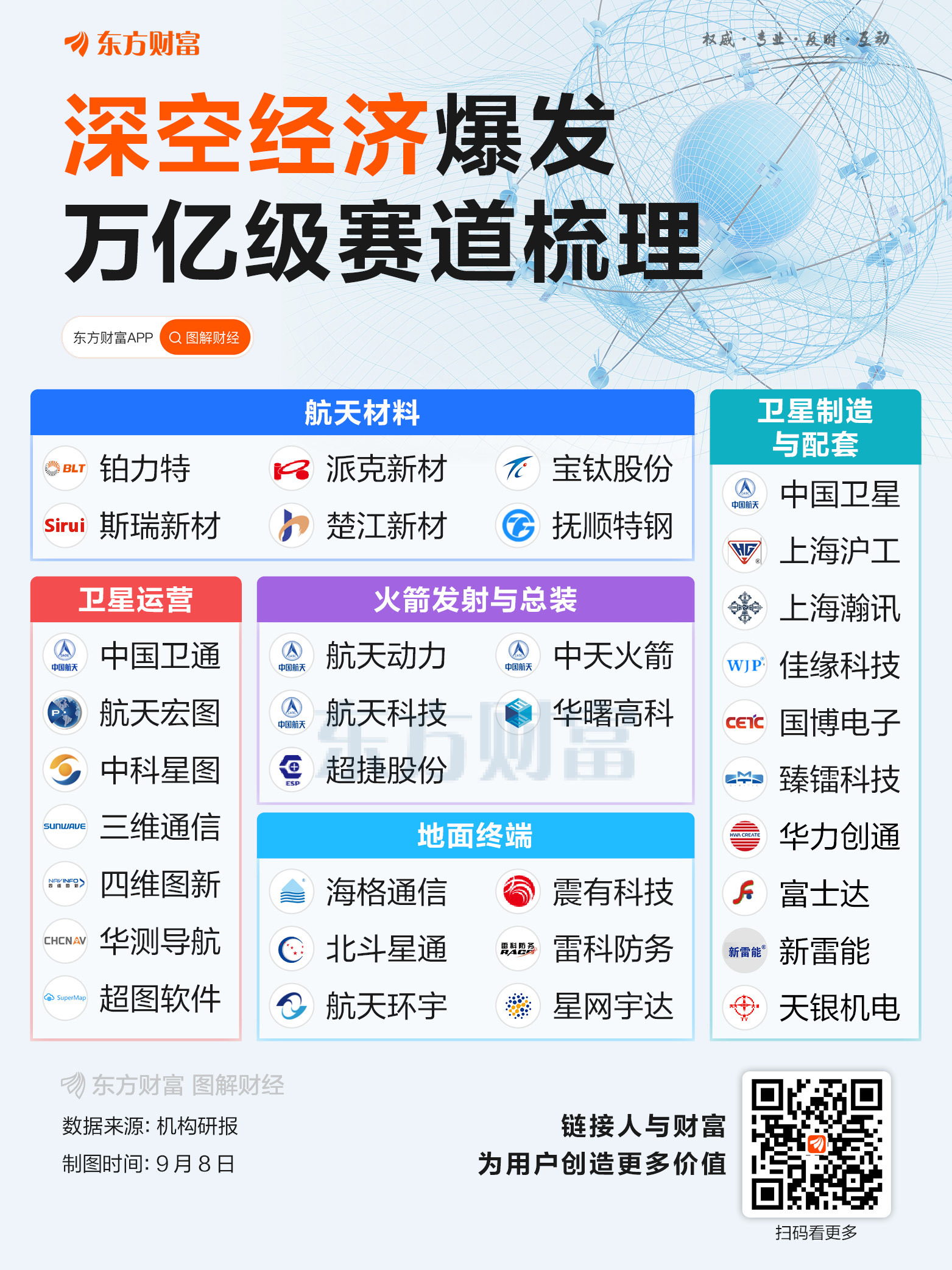 ![]() 周一深空经济概念爆发,创远信科涨超15%,震有科技涨超10%,三维通信、中国卫星、上海沪工等涨停,航天宏图涨超9%,华力创通、中国卫通等强势跟涨。 据中证报,近日首届深空经济与产业发展大会在安徽合肥召开。此次大会意义重大,不仅首次提出“深空经济”概念框架,并预计2040年全球深空经济规模将达到万亿美元。 中国探月工程总设计师、深空探测实验室主任兼首席科学家吴伟仁介绍,国内外近年来广泛开展的月球、行星、小行星等系列深空探测活动,带动了空间科学、空间技术和空间应用的巨大进步,深空已经成为引领科学技术发展的制高点。 深空探测实验室总工程师史平彦在报告中预计2040年全球深空经济规模将达到万亿美元。 中科宇航董事长杨毅强表示,“商业航天已经从进入太空,转向利用太空、驻留太空。深空经济发展不是一蹴而就的,需要提前布局核心方向,助力产业稳步落地。” 杨毅强认为,未来1-5年,航天产业将完成大规模低轨互联网、导航增强、高分辨率对地观测卫星星座组网,为公众提供便捷、精准、稳定的空间应用服务。而未来5-10年,空间产业将逐步实现从低轨向中高轨以及深空的拓展,通过高效利用太空环境、规模化开发太空资源与能源,推动太空经济持续壮大并形成产业规模。 财通证券研报认为,目前我国商业航天产业仍处于快速扩张的建设初期,卫星平台及载荷制造、火箭发射环节仍有待突破,产能具有稀缺性。随国内可回收火箭迎来密集首发,重要低轨卫星互联网组网加速, 产业多环节有望迎来积极变化。 (文章来源:东方财富研究中心) |