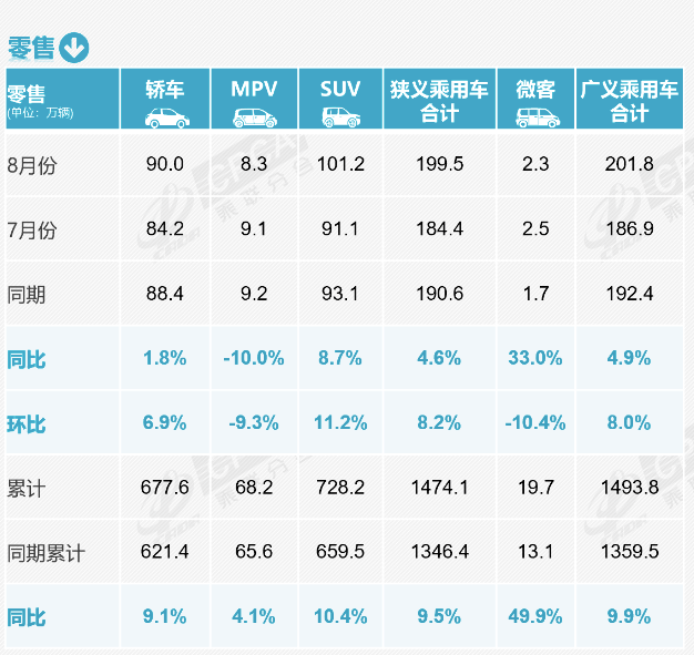 9月8日,乘联分会发布的最新数据显示,今年1~8月,全国乘用车市场累计零售销量为1474.1万辆,同比增长9.5%。图片来源 乘联分会从数据来看,今年8月,全国乘用车零售销量再创新高,较2023年8月192万辆的历史最高水平 ...