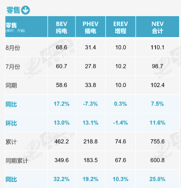 9月8日,乘联分会发布的最新数据显示,今年1~8月,全国乘用车市场累计零售销量为1474.1万辆,同比增长9.5%。其中,8月,全国乘用车市场零售销量为199.5万辆,同比增长4.6%,环比增长8.2%。 图片来源:乘联分会 从数据来看,今年8月,全国乘用车零售销量再创新高,较2023年8月192万辆的历史最高水平增长了3.7个百分点,呈现了逐步平缓的增长态势。“反内卷浪潮正推动车市向‘降价减少、促销平缓’的方向转变,车市运行日益平稳。”乘联分会秘书长崔东树表示。 据崔东树介绍,根据车企官宣降价或新车价格实质性突破近两年最低指导价的规则统计,今年8月有23款车型降价(去年同期29款,2023年同期25款),当前市场保持相对稳定。新能源乘用车的促销力度维持在10.7%的中高位水平,较同期增加2.5个百分点;传统燃油车的促销力度稳定在22.9%的水平上,较同期增加0.9个百分点。 新能源乘用车零售渗透率连续5个月超50% 8月,自主品牌继续保持平稳增长态势,零售销量为132万辆,同比增长9%,环比增长8.6%。当月自主品牌国内零售份额为65.7%,同比增长2.3个百分点。1~8月自主品牌零售市场份额64%,较去年同期增长6.2个百分点。 对于自主品牌乘用车持续保持高增长的原因,崔东树认为,这主要得益于自主品牌在新能源车市场和出口市场获得了明显增量,主流车企转型升级表现优异。 8月,主流合资品牌没有延续7月的销量回暖态势,零售销量为47万辆,同比下降2%。细分来看,德系品牌零售份额为14.2%,同比下降2.4个百分点;日系品牌零售份额为12.5%,同比下降0.1个百分点;美系品牌市场零售份额为6%,同比增长0.2个百分点;韩系和其他欧系品牌零售份额均有微增。 豪华车方面,8月,豪华车零售销量为21万辆,同比下降5%,环比增长21%。当月,豪华品牌零售份额为10.5%,同比下降1.1%。 作为国内车市重要增长力,8月,国内新能源乘用车市场呈现出由报废更新、置换更新叠加新能源免征购置税等普惠政策托底背景下的平稳增长。 图片来源:乘联分会 数据显示,8月,国内新能源乘用车市场批发销量达128.2万辆,同比增长22.3%,厂商批发渗透率52.2%,较2024年8月提升3.3个百分点;零售销量为110.1万辆,同比增长7.5%,环比增长11.6%,零售渗透率增长至55.2%,较去年同期提升1.5个百分点。 值得一提的是,这已是新能源乘用车在国内总体乘用车市场的零售渗透率第5个月超过50%。 增程车批发销量同、环比均下滑超9% 曾被视为“续航焦虑解药”的增程式汽车(以下简称增程车),在经历了几年高速增长后,今年夏天遭遇了“寒流”。 继7月份批发销量出现大幅下滑后,8月的增程车批发销量同比下滑幅度进一步扩大,零售销量同比微增。乘联分会数据显示,8月,增程车批发销量为9.9万辆,同比下滑9.5%,环比下滑9.2%;零售销量同比增长0.3%,环比下滑1.4%。 图片来源:乘联分会 与之形成鲜明对比的是,纯电动汽车同期销量同比增幅最高超38%。当月,纯电动乘用车零售和批发销量分别为68.6万辆和81.5万辆,同比分别增长17.2%、38.5%。 “当前,增程车的发展处于高速增长后的调整期。未来,增程车仍会有一定市场份额,但重回到原来高增长态势,难度很大。”崔东树在接受《每日经济新闻》记者采访时表示。 前几年,增程式车成为新能源市场的“宠儿”。理想汽车通过增程路线精准击中用户对续航焦虑的痛点,实现了销量爆发,并吸引了众多追随者。吉利、奇瑞、长安、比亚迪等头部玩家先后将增程纳入产品矩阵;零跑汽车、小鹏汽车等造车新势力持续加码;小米汽车也将增程车型作为重要布局;通用、福特、现代等也纷纷披露了增程车型的研发与上市规划。 然而,曾经的高速增长态势在2025年出现了转折。记者查阅乘联分会发布销量数据发现,增程车批发销量在今年前8个月中,有3个月出现同比下滑。1~8月,国内增程车市场厂商批发份额也从2024年的10.27%下滑至8.81%,远低于纯电和插电式混合动力乘用车。 在外界看来,增程车市场的遇冷并非偶然。在纯电技术飞速发展与补能网络持续完善的双重推动下,增程车曾经引以为傲的竞争优势正逐步被弱化。一方面,纯电车型的续航能力显著提升,充电效率也迎来跨越式进步,800V高压平台正在加速普及。这些技术突破使得纯电动车的使用短板被迅速补齐,其固有优势则被进一步放大。 另一方面,随着动力电池核心原材料成本的大幅下降,纯电动车的制造成本持续走低,价格竞争力不断增强。这也意味着,增程车赖以生存的“无续航焦虑”这一核心卖点,正在逐渐失去其原有的市场吸引力。 “随着长续航里程纯电动车越来越多,以及充电技术的大幅提升,使得消费者对纯电动车的接受程度越来越高。尤其是在近期纯电动产品不断补齐完善的情况下,纯电动车发展走势会越来越好。”崔东树认为,纯电动技术路线始终是我国新能源汽车的核心发展方向。 值得注意的是,曾高度依赖增程路线撑起销量的部分车企,如今不仅增速明显放缓,部分还出现了产品战略的转向。 崔东树表示,未来,增程车市场在新产品、新技术出来后仍会有所回暖,但不会再回到早前高速增长盛况。“2025年最后几个月中,增程车增速会进一步放缓,全年增速会在个位数水平上。”崔东树称。 每日经济新闻 (责任编辑:郭健东 )