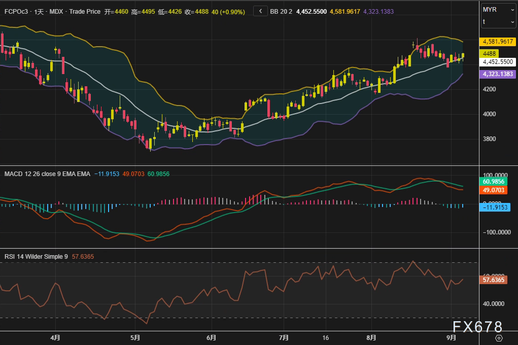 周一 9月8日 马来西亚衍生品交易所BursaMalaysia棕榈油主力FCPOc3合约结束日内调整 收盘报4488林吉特 吨 较前一交易日上涨40林吉特 涨幅0 9 日内价格波动区间介于4323 4582林吉特 技术指标显示RSI ...