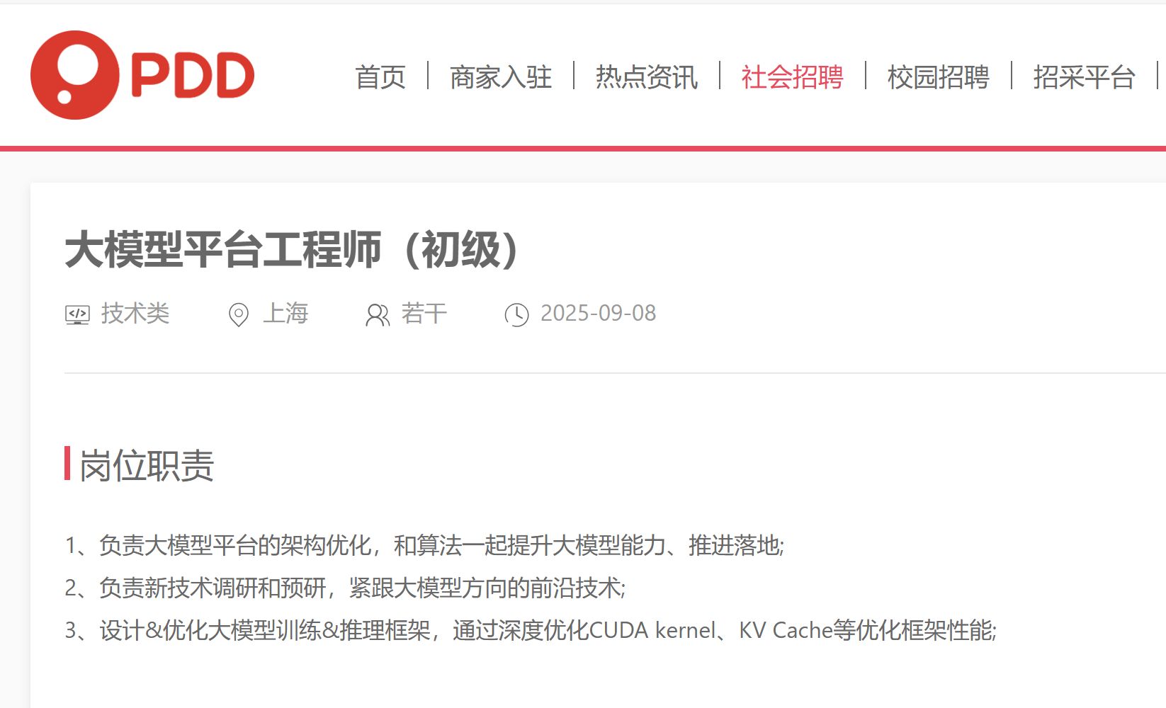 《每日经济新闻》记者注意到,9月8日,拼多多官网社会招聘的技术类岗位中,最新发布包括“大模型平台工程师”“机器学习平台工程师”等在内的多个职位需求。自8月以来的招聘中,与AI和大模型密切相关的职位还包括“多模态大模型算法工程师”“跨境搜索推荐-大模型Infra架构工程师”“大模型应用算法工程师”“多模态大模型系统工程师”等。 更早之前的今年2月,就曾有消息称拼多多内部已组建电商推荐大模型团队,但拼多多对此并未做出回应。 有拼多多商家在接受《每日经济新闻》记者微信采访时透露,拼多多在AI和跨境电商上,都是很激进的。在他看来,拼多多在AI上的激进在于正用AI做真正的业务。 研发投入持续增长 黄峥技术基因早已植入拼多多在All in AI的行业浪潮中,拼多多在AI领域却显得格外低调,对外极少发声。然而若将时间轴拉长至更早之前,在拼多多的起步阶段,其创始人黄峥曾多次提及一个关键理念——“分布式AI”。 所谓“分布式AI”,指的是将人工智能能力分散至多个节点或终端,通过去中心化的智能代理网络实现协同决策与任务执行,而非依赖于单一、集中式的AI“超级大脑”。 对于这一理念在拼多多上的应用,黄峥曾在拼多多2018年招股说明书所附的《致股东信》中明确提出:“如果我们闭上眼睛畅想下一阶段的拼多多,它可以被理解为一个融合虚拟空间与现实世界的多维场景。它将不是由集中式超级大脑型AI系统驱动,而是依托分布式智能代理网络运作,兼具Costco的高性价比与迪士尼的娱乐体验。” 作为本科就读于浙江大学竺可桢学院计算机专业、后又赴威斯康星大学麦迪逊分校取得计算机硕士学位的创始人,黄峥为拼多多注入了深厚的技术基因。 在2018年第三季度财报电话会中,他曾明确表示:“公司将持续大幅增加技术投入,运用基于分布式人工智能架构的深度学习模型,持续提升产品及推广推荐的精准度。目前,拼多多正和世界各地科研机构合作,以提升公司在分布式人工智能领域的技术能力,我本人将直接领导相关工作。”据当时财报,该季度拼多多研发费用增至3.32亿元,同比增幅高达828%,环比增长80%。 然而自黄峥卸任后,拼多多在AI领域的对外发声明显减少,即便行业已进入激烈竞逐AI叙事的新阶段,公司仍保持相对的“战略沉默”。 沉默背后,拼多多也正面临现实的业绩压力。2025年第二季度财报显示,公司总营收为1040亿元,同比增长7%,增速继续放缓;同期实现净利润327亿元,同比下滑约5%。拼多多董事长兼首席执行官陈磊在总结利润下降原因时,再次提及从今年4月开始的“千亿元扶持”计划;3位管理层人员在财报电话会上也多次给市场打“预防针”,持续淡化对未来业绩的预期。为应对当前电商平台加码即时零售,内容平台推进电商业务等激烈竞争态势,赵佳臻表示,平台会主动选择加大投入、牺牲部分利润,以拓宽中小商家发展空间。 值得注意的是,拼多多在研发方面的投入正在提升。2025年第一季度,研发支出35.8亿元,高于去年同期的29.1亿元及市场预期;第二季度研发投入35.9亿元,继续保持同比增长。尽管如此,与阿里、腾讯等动辄将6%~10%的营收用于研发相比,拼多多研发费用占收入比重始终控制在4%以内,某种层面仍显示出其谨慎且差异化的技术投入策略。 岗位更多“实用主义” 商家评价:拼多多AI很“激进”8月份以来,拼多多密集展开AI人才招募,迅速引发外界关注。 记者注意到,在其官网的社会招聘栏目中,技术类岗位已集中上线多个与大模型和人工智能高度相关的职位,包括大模型平台工程师、多模态算法工程师、跨境搜索推荐—大模型Infra架构工程师、大模型应用算法工程师、多模态大模型系统工程师等。 从岗位职责描述具体来看,拼多多正在推进的AI与大模型业务显得极为具体,透露出鲜明的“实用主义”倾向。 以“大模型应用开发工程师”为例,该岗位需负责拼多多核心电商场景下的大模型Agent(智能体)开发与优化,覆盖搜索、推荐、商业化等多个板块,并支持AI对话搜索、智能导购、图文生成与数字人等业务功能的高效落地。 还有诸如“大模型平台工程师”负责大模型平台的架构优化,和算法一起提升大模型能力、推进落地。“多模态大模型算法工程师”则负责多模态大模型基础模型研发,构建电商领域图像、文本多模态大模型基座等。 这与当前众多大厂热衷于推进通用大模型的战略形成鲜明对比。拼多多在电商领域的几位竞争对手,阿里巴巴、抖音等对AI大模型都有大量投入,并且将自研大模型作为重点进行突破。 今年2月,阿里巴巴集团CEO(首席执行官)吴泳铭宣布未来三年将投入超3800亿元建设云和AI硬件基础设施,这一金额超过过去十年投入总和。今年年初,阿里国际宣布旗下面向全球B2B(企业间的电子商务)买家的首个AI搜索引擎Accio接入DeepSeek等最先进的推理模型,正式上线深度研究、商业探索等功能。并且基于通义千问大模型,阿里AI合作的边界正在拓展,目前其应用已扩展到汽车、金融、教育、医疗等多个行业。 拼多多AI则更多还是围绕“电商”这一内核在推进。 一位同时在多家电商平台上(拼多多占其年销售额60%左右)主营童装的商家在接受《每日经济新闻》记者微信采访时认为,拼多多在AI和跨境电商上,都是很“激进”的。他举例,“在Temu(拼多多的跨境电商平台)上,几乎所有流程