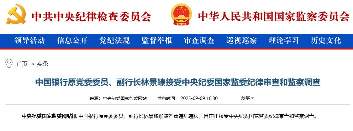 中国银行原党委委员、副行长林景臻涉嫌严重违纪违法,目前正接受中央纪委国家监委纪律审查和监察调查。 (文章来源:央视新闻客户端)