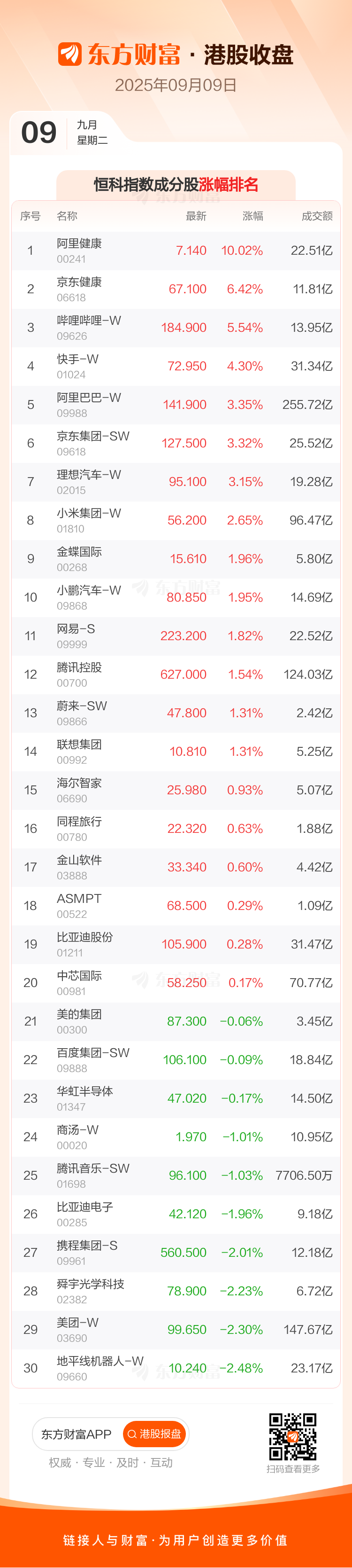 港股9月9日收盘走高,恒生指数收报25938.13点,涨304.22点,涨幅1.19%;恒生科技指数收报5828.74点,涨74.99点,涨幅1.3%。恒生指数成分股中阿里健康、京东健康、华润万象生活涨幅居前,药明生物、石药集团、中 ...
