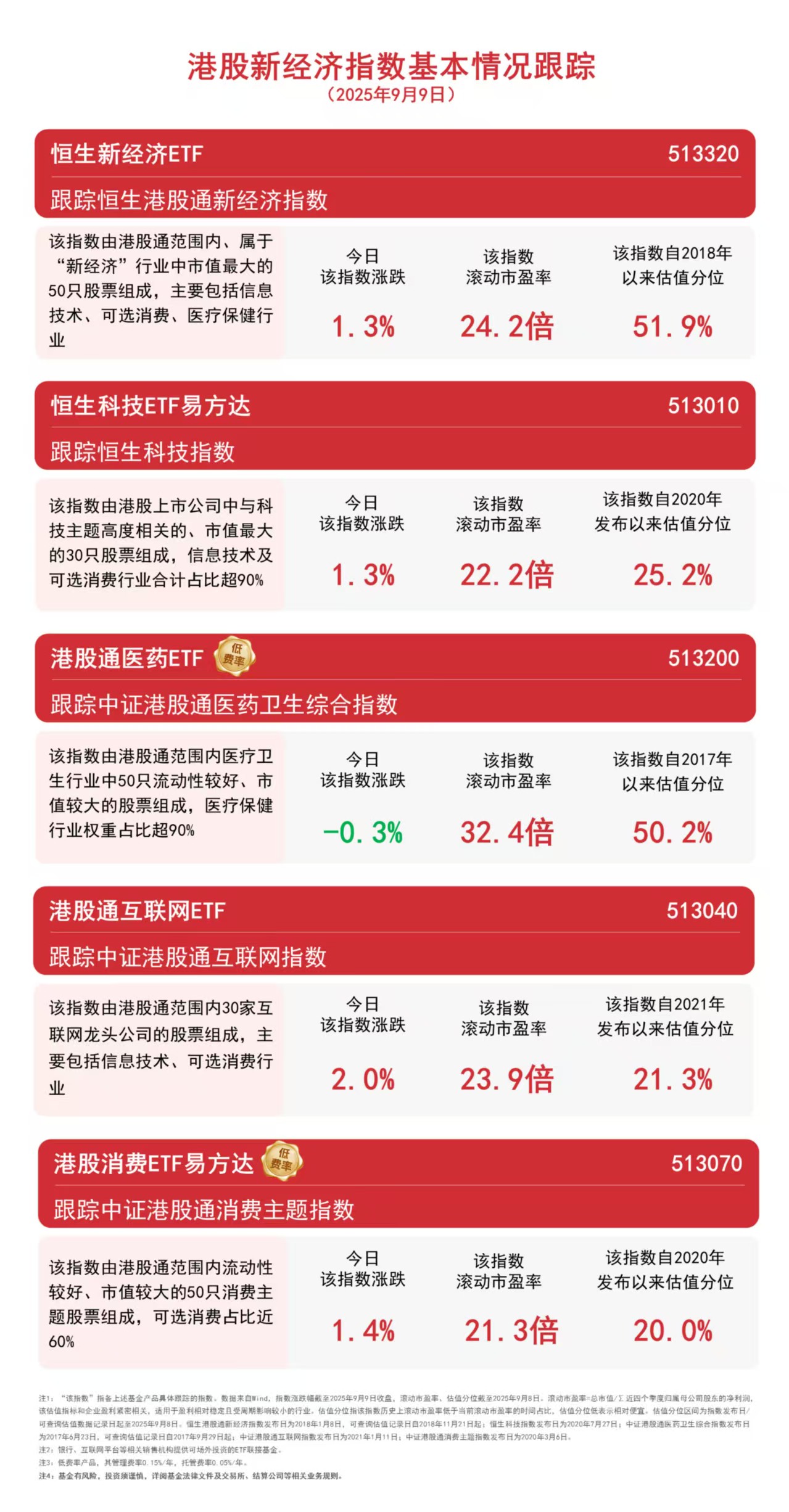 截至收盘,中证港股通互联网指数上涨2.0%,中证港股通消费主题指数上涨1.4%,恒生港股通新经济指数、恒生科技指数均上涨1.3%,中证港股通医药卫生综合指数下跌0.3%。Wind数据显示,截至昨日,恒生科技ETF易方达(513 ...