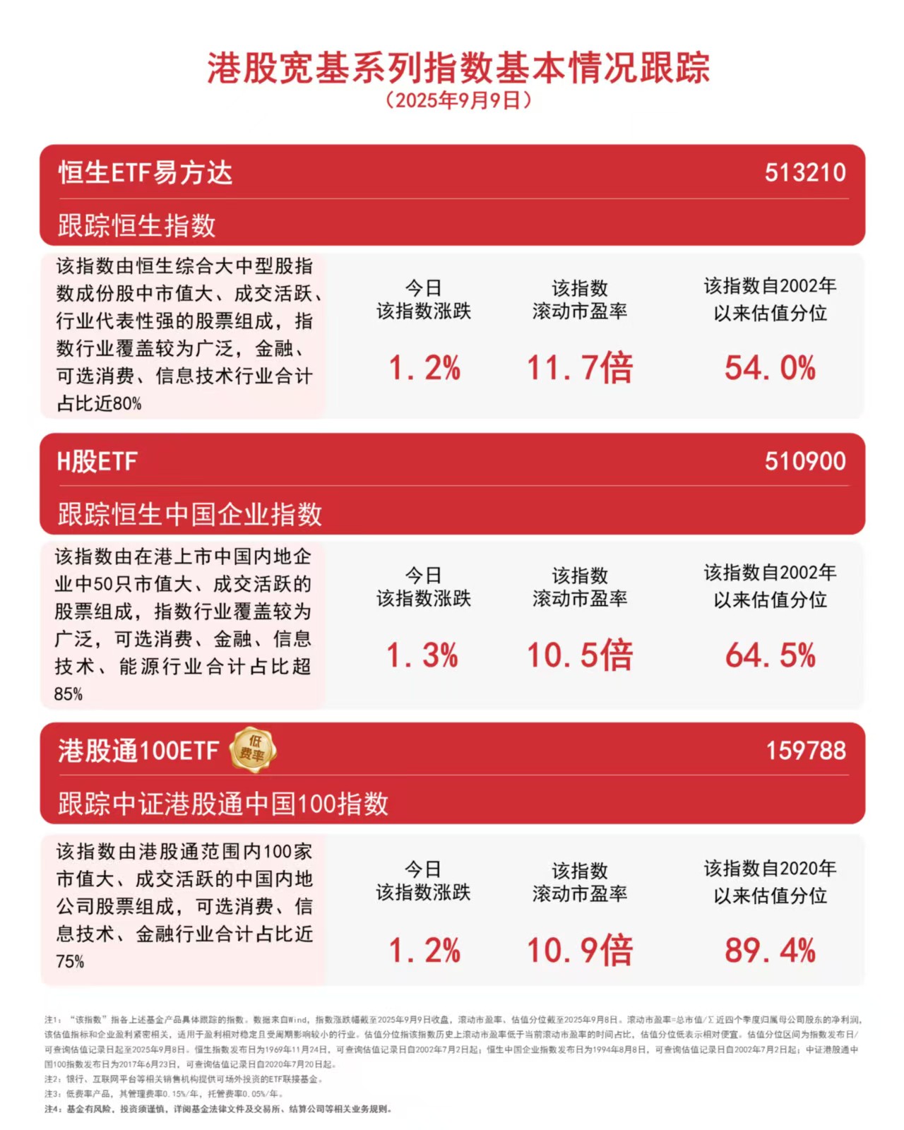 港股今日延续涨势,黄金股大涨、地产股强势反弹,科技、金融板块普涨,南向资金全天净买入超100亿港元。截至收盘,恒生指数上涨1.2%、创近四年新高,恒生中国企业指数上涨1.3%,中证港股通中国100指数上涨1.2%。 ...