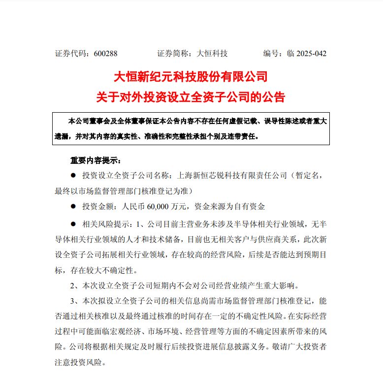 9月9日深夜,大恒科技(600288)公告称,公司拟以自有资金出资6亿元在上海市普陀区投资设立全资子公司上海新恒芯锐科技有限责任公司(下称“新恒芯锐”)。 ![]() 图片来源:大恒科技公告 公告称,本次投资设立全资子公司拟从事半导体相关辅助设备业务,子公司设立有利于公司完善在半导体行业、新兴产业领域的业务布局,实现公司多维度战略发展突破。 公告表示,公司目前主营业务未涉及半导体相关行业领域,无半导体相关行业领域的人才和技术储备,目前也无相关客户与供应商关系,此次新设全资子公司拓展相关行业领域,存在较高的经营风险,后续是否能达到预期目标,存在较大不确定性。 公开资料显示,目前,大恒科技的主营业务包括机器视觉及信息技术业务、光机电一体化业务、电视数字网络编辑及播放系统业务三大板块。其中机器视觉及信息技术业务包括机器视觉业务、信息系统集成业务;光机电一体化业务包括光机电业务、光学薄膜业务。机器视觉行业系半导体行业的上游。 今年上半年,大恒科技实现营业收入8.44亿元,同比增长6.89%;亏损274.05万元。 证券时报·e公司注意到,自控制权变更以来,大恒科技身上发生了诸多变化。 此前,徐翔母亲郑素贞所持有的大恒科技1.3亿股股份(持股比例为29.75%)的司法拍卖完成。这笔股权被8名投资人“分食”。其中,李蓉蓉拿下2746万股,从而持有大恒科技6.29%的股权,取代郑素贞成为大恒科技单一第一大股东。 8月初,上述拍卖的股权过户完成。郑素贞不再持有大恒科技股份。8月中旬,李蓉蓉与周正昌签署《一致行动人协议》,二者合计持有大恒科技股份4046万股,占公司总股本的9.26%。 控制权变更后,大恒科技管理层的变动随之而来。 8月下旬,公司宣布,其董事会提名王蓓为非独立董事候选人;同期,公司原董事、董事长、总裁鲁勇志辞职,由董事、副总裁谢燕顶上。同时,公司聘任刘凯担任公司副总裁,聘任唐石担任公司财务总监。 在大恒科技2025年第二次临时股东大会上,王蓓顺利当选为公司董事,并随之被选举为公司副董事长。 对于此番设立新恒芯锐,上市公司表示,公司的主营业务未涉及半导体相关行业领域,无半导体相关行业领域的人才和技术储备,目前也无相关客户与供应商关系,此次新设全资子公司拓展相关行业领域,存在较高的经营风险,后续是否能达到预期目标,存在较大不确定性。 值得一提的是,在郑素贞持股拍卖中,中国新纪元耗资2.37亿元受让了1800万股(持股比例为4.12%)。 中国新纪元控股宁波电子信息集团(下称“宁波电子”)。宁波电子官网称,公司直接或间接控股、参股企业所涉产业包括高性能集成电路、泛半导体材料等。 截至9月9日收盘,大恒科技报12.74元,当日涨幅2.58%,市值55.65亿元。