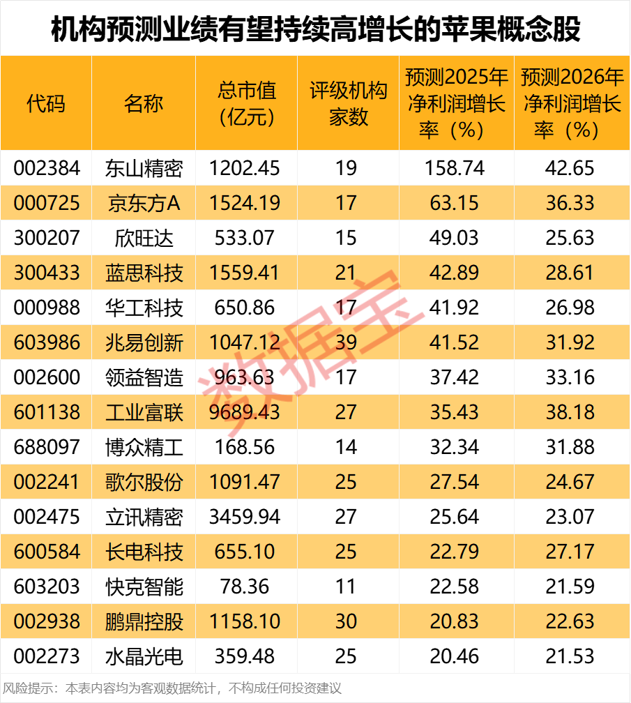 9月以来,超20只苹果概念股获得融资客加仓。 苹果秋季新品发布会,iPhone Air发布 北京时间今日凌晨1点,苹果举行秋季发布会,推出了iPhone 17、iPhone Air、iPhone 17 Pro及iPhone 17 Pro Max在内的四款机型。iPhone 17起售价为799美元,iPhone Air起售价为999美元。此外,苹果还发布了具备AI支持的实时翻译功能的AirPods Pro 3,售价249美元。 iPhone Air以“史上最薄”设计和eSIM全面普及为卖点,是迄今最薄的iPhone,厚度仅有5.6mm。同时,该机引入 eSIM 技术(全球市场均使用 eSIM,含中国内地市场),实现了通信技术的变革。同时在苹果 iOS 26 加持下引入 AI 省电技术,号称可以帮助用户“顺利使用一整天”。 iPhone 17标准版迎来了近年来最重大的一次升级,其配备了一块更大的6.3英寸超视网膜XDR显示屏,首次在标准版上支持ProMotion自适应刷新率技术;搭载了全新的A19仿生芯片,采用先进的3nm工艺制程,配备6核CPU和5核GPU;后置配备4800万像素主摄和超广角镜头,成像质量大幅提升。 iPhone 17 Pro及以上版本,采用A19 Pro芯片,晶体管密度提升了15%,GPU增至6核,还支持70亿参数大模型本地运行。iPhone 17 Pro系列还配备了苹果“有史以来最大的电池”,iPhone 17 Pro Max电池容量接近5000mAh,厚度从上一代的8.25毫米增长到了8.725毫米。 苹果CEO库克表示:“iPhone 17 Pro的各个机型,是我们Pro系列的新巅峰。这些新款iPhone也意味着iPhone的空前飞跃。” 天风证券研报表示,看好政策加持、巨头引领、发布会催化临近背景下,端侧AI相关投资机遇。苹果近期动态彰显其在端侧AI方面产品创新决心,对使用体验及销量的拉动有超预期的可能,建议关注苹果产业链。 融资客大手笔加仓10只概念股 据证券时报·数据宝统计,A股市场苹果概念股年内平均上涨32.89%,整体表现大幅度优于大盘,恒宝股份、工业富联、东山精密、科森科技年内累计上涨幅度均超100%。 8只概念股市值规模超千亿元,工业富联市值规模最大,最新市值9689.43亿元,公司在近期的调研活动中表示,公司对机构件业务在下半年及明年的表现持积极态度,预期在产品加工工艺难度提升、客户产品周期迭代的双重带动下,有机会实现更好的盈利弹性。 立讯精密的市值规模次之,达3459.94亿元,公司近期表示,基于对从零件到模组再到成品全产业链的深入洞察,公司认为三四季度的消费电子市场需求将呈现平稳略增的态势。 从近期资金面来看,9月以来,超20只概念股获得融资客加仓,其中10只的净买入额超1亿元,兆易创新和东山精密9月以来融资净买入金额居前,分别达11.58亿元和11.01亿元。 ![]() 从业绩数据来看,今年上半年,光大同创、中科三环、得润电子、深天马A等6股的净利润实现扭亏;创远信科、苏州固锝、闻泰科技的上半年净利润增幅居前,均同比增长超200%。 业绩预期方面,获10家以上机构给予评级的苹果概念股中,有15只概念股2025~2026年业绩有望持续超20%增长,东山精密是苹果公司的重要供应商,为其提供柔性印刷电路板(FPC)等产品,机构预测2025年和2026年东山精密的净利润增幅分别为158.74%和42.65%。 ![]() (文章来源:证券时报网) |