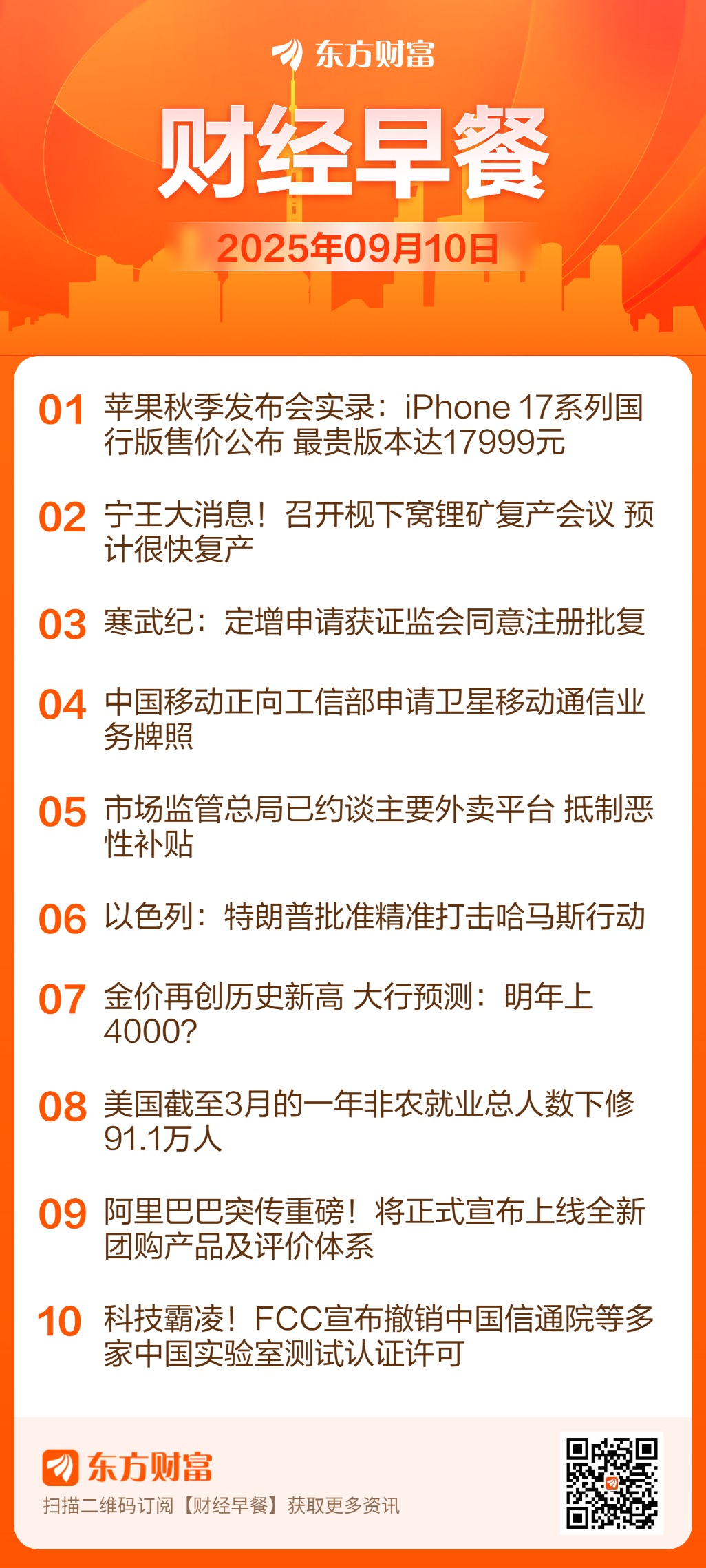 ![]() 每日精选苹果发布会: 苹果举办秋季新品发布会,先后发布了AirPods Pro、三款Apple Watch以及全新的iPhone 17系列。苹果中国官网显示,iPhone 17(256GB)的起售价为5999元人民币,iPhone Air为7999元;iPhone Pro为8999元,Pro Max为9999元。本次最贵版本的iPhone 17 Pro Max售价17999元,为iPhone历代以来最高价格。9月12日晚8点开始接受预购,9月19日发售。 锂矿复产: 据悉,9月9日上午,宁德时代控股子公司宜春时代新能源矿业有限公司召开“枧下窝锂矿复产工作会议”,专题推进枧下窝锂矿复产工作。据知情人士透露,宁德时代枧下窝锂矿采矿权证及采矿许可证审批进展顺利,预计很快将复工复产,“比市场上最快的预期还要快。” 寒武纪定增: 寒武纪9月9日公告,公司于近日收到证监会出具的《关于同意中科寒武纪科技股份有限公司向特定对象发行股票注册的批复》,同意公司向特定对象发行股票的注册申请。 就业数据修正: 美国截至3月的一年非农就业总人数下修91.1万人,市场预估为下修70万。美国劳工统计局称,过去十年间,年度基准修订绝对值的平均水平为非农就业总数的0.2%。 卫星通信: 据记者报道,中国移动正在申请卫星移动通信业务经营许可,为依法合规开展手机直连卫星业务奠定政策基础,目前该申请已进入审核流程。记者了解到,在星地融合通信方面,中国移动已有不少实践。2024年6月,中国移动完成全球首个手机直连高轨卫星基于运营商网络IoT-NTN IMS的语音通话实验室验证,2024年7月成立星地融合技术研究所,全面开展卫星通信技术攻关。2024年11月,中国移动携手中国时空发布北斗短信业务,使得无网络环境下的通信成为可能。 外卖竞争: 记者从市场监管总局召开的例行发布会上了解到,针对近期外卖平台补贴争议,市场监管总局新闻发言人王秋苹介绍,市场监管总局已经及时约谈主要外卖平台,相关平台快速响应,集体发声,承诺严守法律法规,杜绝不正当竞争,抵制恶性补贴,推动行业规范有序发展。 纪委审查: 9月9日,中国银行党委召开会议,传达中央纪委国家监委对林景臻涉嫌严重违纪违法进行纪律审查和监察调查的决定。与会同志一致表示,坚决拥护党中央决定,坚决拥护中央纪委国家监委决定。 黄金: 9月9日,现货黄金(伦敦金现)盘中一举突破3650美元/盎司关口,再次刷新历史纪录。国际现货黄金在本周已一举突破了1980年1月通胀调整后的历史高点。今年现货黄金累计涨幅近1000美元,涨幅高达近40%。 科技霸凌: 当地时间9月8日,美国联邦通信委员会(FCC)在其官网宣布,撤销多家中国实验室对进入美国市场电子产品的测试认证许可。FCC要求发射无线电频率的电子设备都必须获得在美国使用的认证,此前这些实验室为进入美国市场的电子产品提供FCC安全认证。这无疑又是一次典型的科技霸权行为。此前,美方多次泛化国家安全概念,滥用出口管制和“长臂管辖”,严重扰乱了全球产供链稳定。 阿里团购传闻: 9月9日早上,市场突然传出,阿里将于明后天正式宣布上线全新团购产品及评价体系,直接对标美团核心业务。而据记者获悉,周三(9月10号)上午,在杭州西溪C区阿里的确有一场重磅业务发布会,活动时间是上午半天。但阿里方面并未说明是否为团购业务发布会。 热点题材人工智能: 9月9日,杭州市经济和信息化局就《杭州市加快发展人工智能终端产业三年行动方案(2025-2027年)(征求意见稿)》(以下简称“《方案》”)公开征求意见。根据《方案》,到2027年,杭州市人工智能终端产业规模力争达到3000亿元。实施人工智能终端方向重点科研计划项目100个,打造爆款终端产品30款,培育形成自主品牌20个,选树典型应用场景50个。谋划内生裂变项目100个,招引落地亿元以上重大项目150个。 固态电池: 固态电池产业利好频传。9月以来,珠海冠宇、亿纬锂能、先导智能、国轩高科等多家A股上市公司密集披露固态电池领域的进展。作为具备高安全性和高能量密度的前沿技术,固态电池长期以来被视为解决新能源汽车起火问题,缓解人形机器人和低空飞行器续航压力的重要途径。行业人士表示,当前固态电池行业正处于从实验室验证向产业化过渡的关键阶段。政策、资金多方助力,推动产业落地加速。 飞行汽车: 据小鹏汽车官方公众号,在低空出行领域,小鹏汇天历经12年研发、投入约6亿美元、完成7代飞行器迭代。小鹏汇天「陆地航母」飞行汽车将于今年10月在迪拜完成全球首飞,这款产品目前在中国市场已收获近5000份订单,并计划于2026下半年正式交付。 碳化硅: 近期,中国科学院半导体研究所科技成果转化企业北京晶飞半导体科技在碳化硅晶圆加工技术领域取得重大突破,成功利用自主研发的激光剥离设备实现了12英寸碳化硅晶圆的剥离。该突破标志着中国在第三代半导体关键制造装备领域迈出重要一步,为全球碳化硅产业的降本增效提供了全新解决方案。 钠电池: 据宁德时代消息,9月5日,宁德时代钠新电池通过了GB38031-2025《电动汽车用动力蓄电池安全要求》(简称“新国标”)认证,成为全球首款通过新国标认证的钠离子电池。上半年,全球钠电出货量达到3.7GWh,同比增长259.0%。 消费电子: 9月进入消费电子新品密集发布期。华为于9月4推出三折叠手机MateXTs非凡大师。9月5日,小米集团总经理卢伟冰转发网友提问“小米16真的提档了?”并回答“嗯,快了”;这意味着小米16发布或提档。此外,20