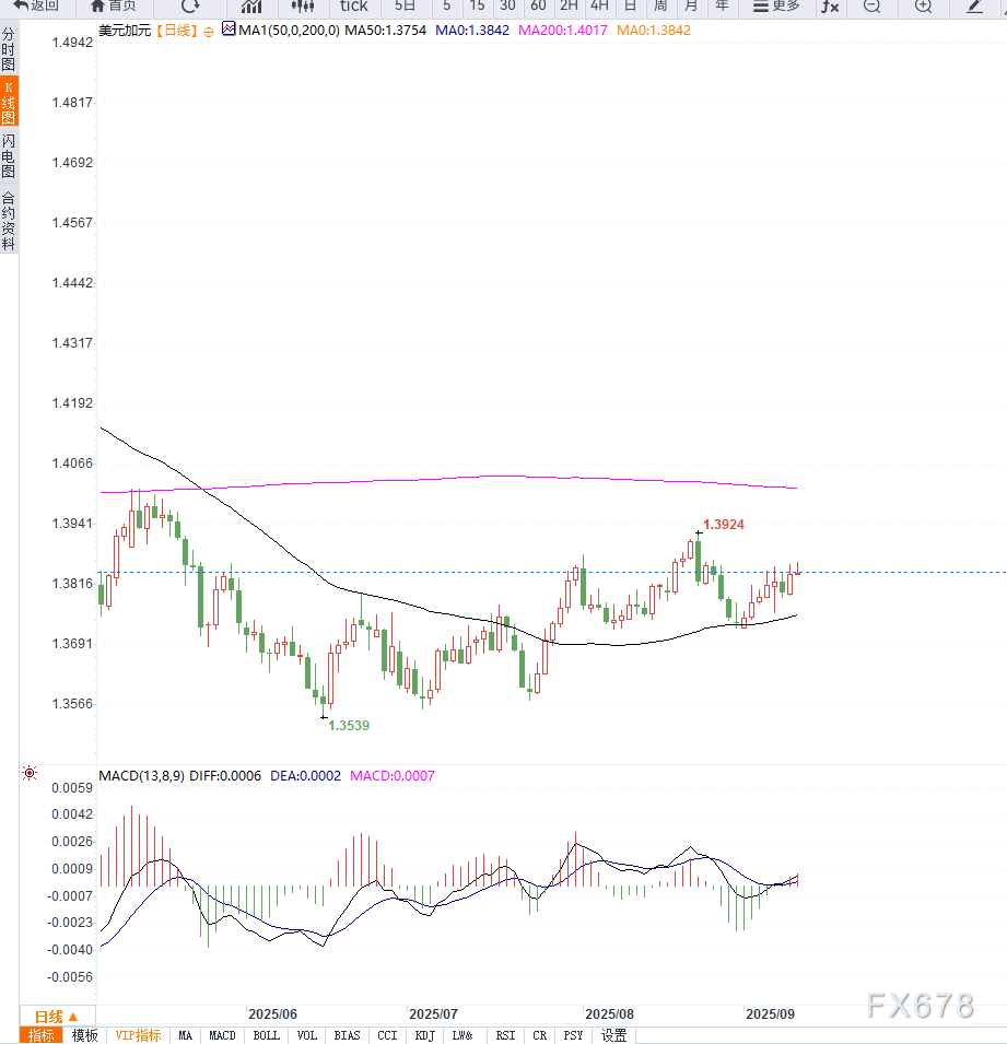 近期加拿大经济数据表现不佳。最新公布的就业数据显示,8月失业率升至7.1%,高于7月的6.9%,也高于市场预期的7.0%。同时,关税担忧持续笼罩市场,打击制造业和服务业信心,令加元缺乏反弹动力。 ![]() 投资者目前正等待8月PPI数据,以及周四的CPI,以进一步判断美联储的降息幅度和节奏。 从日线来看,USD/CAD延续反弹趋势,目前交投在1.3855附近:1.3900为近期强阻力,若突破可能打开进一步上行空间,目标指向1.3950。下方1.3800为近期重要支撑,若跌破可能下探1.3740一线。 技术指标上,RSI保持在中性偏强区域,显示多头力量仍有优势,但短期内可能面临高位震荡整理。 ![]() ![]() |
