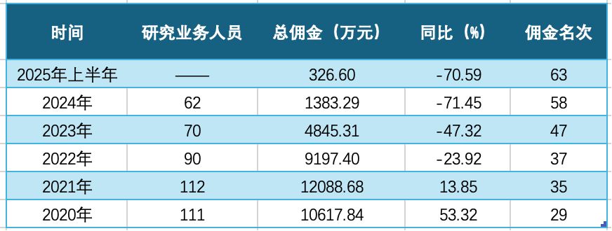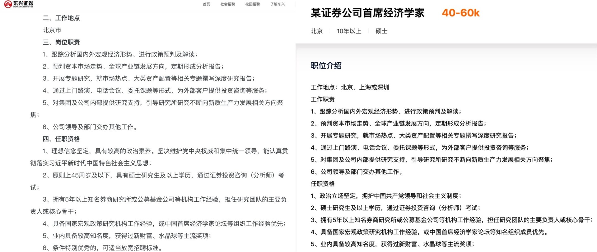 每经记者|陈晨 每经编辑|叶峰 9月9日,东兴证券官网发布两则公开招聘公告,其中公开招聘首席经济学家的消息引发业内广泛关注。要知道,业内公开招聘首席经济学家的情况并不多见。此次东兴证券招聘的首席经济学家岗位,不仅明确了相关岗位职责,任职资格也非常严格,且要求应聘者在业内具备较高知名度。 值得注意的是,自2019年原首席经济学家张岸元离职后,东兴证券首席经济学家一职已空缺多年,且近年来其研究所发展不容乐观,研究业务人员从2020年的111人逐年下滑至2024年的62人,分仓佣金收入更是从2020年的1.06亿元跌至2024年的1383.29万元,2025年上半年同比再下滑70.59%。此外,今年以来券商首席经济学家变动频繁,多家券商都出现了首席经济学家的任职或离职情况。 东兴证券招聘首席经济学家,要求具备较高知名度 从东兴证券此次发布的招聘信息来看,首席经济学家的岗位职责清晰且全面,涉及多个关键领域。包括跟踪分析国内外宏观经济形势、预判资本市场走势、参与上门路演和电话会议,以及为集团内部提供研究支持等。 在任职资格方面,东兴证券提出了多方面要求。从学历和年龄来看,原则上要求45周岁及以下,拥有硕士研究生及以上学历。 工作经验上,需拥有5年以上知名券商研究所或公募基金公司等机构工作经验,且要担任过研究团队的主要负责人或核心骨干,确保具备丰富的行业实践经验。此外,具备国家宏观政策研究机构工作经验,或在中国首席经济学家论坛等组织有工作经验的应聘者将被优先考虑,若在业内具备较高知名度,获得过新财富、水晶球等主流奖项,也会成为重要加分项。 值得关注的是,东兴证券此次公开招聘公告中未提及首席经济学家岗位的具体薪酬。不过记者在招聘网站上发现一则“某证券公司首席经济学家” 的招聘信息,其标注的薪酬范围为40k-60k,且该岗位的工作职责与任职资格要求,与东兴证券此次招聘内容高度重合。 注:左为东兴证券招聘信息,右为第三方招聘网站信息 值得一提的是,中国证券业协会在去年12月曾下发通知,为券商首席经济学家的聘任划定了规范底线,包括需具备良好的职业道德、较高的学术研究水平、扎实的理论功底和一定的社会影响力。此外,公司还应重点关注其专业胜任能力、执业声誉、受处罚情况等,不得聘任存在不良执业声誉信息的人员。 人员与收入双降!东兴证券研究业务人员减半,分仓佣金排名跌至行业63名 东兴证券研究所近年来的发展状况不容乐观,这不仅体现在研究业务人员数量的逐年减少上,更直接反映在分仓佣金收入的大幅下滑中。 根据东兴证券年报数据,2020年时,其研究业务人员规模达到111人,2021年人数基本保持稳定,为112人,但从那之后,研究业务人员数量便开始逐年下滑,到2024年时,仅剩62人,与2020年相比,人员数量减少了近一半,这一人员缩减幅度较为明显,无疑会对研究所的研究能力和业务开展产生冲击。 与人员数量下滑相伴的,是东兴证券分仓佣金收入的持续走低。Wind数据显示,2020年,东兴证券的分仓佣金收入为1.06亿元,在行业内的排名为第29名,处于中等偏上的位置;2021年,分仓佣金收入略有提升,达到1.21亿元,行业排名也保持在第29名。然而,从2021年之后,分仓佣金收入便开始走上逐年下滑的道路。到2024年,东兴证券的分仓佣金收入仅为1383.29万元,与2023年相比,同比下滑幅度高达71.45%,行业排名也大幅下降至第58名。 记者根据东兴证券历年年报和Wind数据整理 更令人担忧的是,2025年上半年,东兴证券分仓佣金收入的下滑趋势并未得到遏制,反而进一步加剧。数据显示,2025年上半年,其分仓佣金收入仅为326.60万元,与2024年上半年相比,同比下滑70.59%,行业排名也再次下降,跌至第63名。短短几年时间,东兴证券的分仓佣金收入从亿元级别跌至千万元级别,再到2025年上半年的三百余万元,下滑幅度之大、速度之快,在行业内并不常见。 核心人才接连离开!东兴证券研究所发展遇困,架构调整后引援首席经济学家 东兴证券研究所近年来发展走弱,核心重要人物的接连离职或许也是重要影响因素。早在2019年,东兴证券原首席经济学家张岸元便选择离职,此后,东兴证券首席经济学家这一关键岗位便长期处于空缺状态,再也没有公开相关任职消息。 雪上加霜的是,2022年,原东兴证券研究所所长吴寿康也悄然离职。作为证券市场发展的资深参与者,吴寿康的行业经验十分深厚,他早在1996年便进入君安证券研究所从事行业公司研究工作,是我国最早一批证券分析师。 在核心人才变动后,东兴证券研究所的管理团队也随之调整。据记者了解,目前东兴证券研究所由公司副总经理陈海分管,陈海拥有多年基层营业部工作经历,早期还曾担任过信息研究中心股评部经理,兼具业务一线经验与研究相关履历;而在吴寿康离职后,研究所所长一职则由龚志宏接任,龚志宏此前还曾担任过东兴证券私募子公司东兴资本的负责人。 事实上,在此次公开招聘首席经济学家之前,东兴证券已率先启动内部调整。今年4月29日,东兴证券发布公告称,公司董事会会议审议通过《关于研究所、销售交易部等部门组织架构调整的议案》,这一举措被业内解读为东兴证券欲提振研究所业务的重要先兆。 如今,公司进一步公开招聘首席经济学家,显然是架构调整后的关键后续动作。东兴证券或许希望通过引入专业能力突出、行业