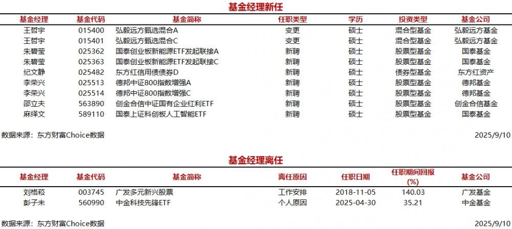 每经AI快讯,据东方财富Choice数据统计,今日新聘基金经理6人,涉及9只基金(A/C类分开计算),主要来自国泰基金、德邦基金等公司。另外,今日有2位基金经理离任。 ...